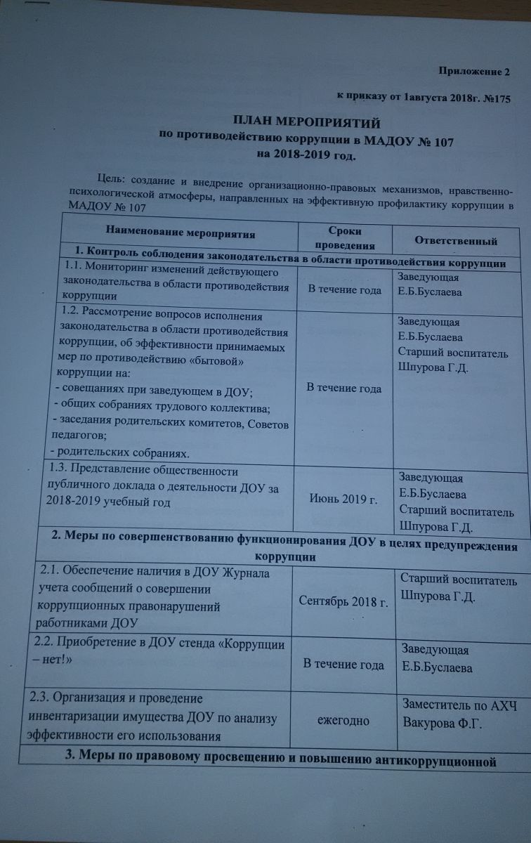 - План мерроприятий по противодействию коррупции в МАДОУ №107 на 2018-2019 год: