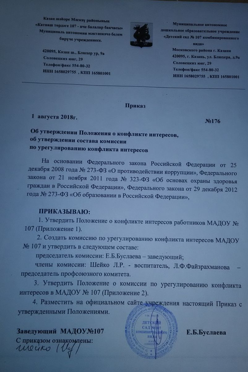 - Приказ об утверждении Положения о конфликте интересов, об утверждении состава комиссии по урегулированию конфликта интересов:/upload/storage/org2913/files/P_20180801_134607[1](1).jpg /upload/storage/org2913/files/прил к пр№176.docx;/upload/storage/org2913/files/прил2 к пр176.docx ;