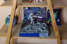 В холле нашего детского сада выставка рисунков и поделок посвященная "Космонавтике"
