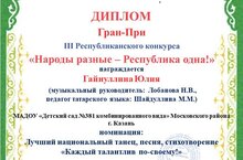 Поздравляем Гайнуллину Юлию и педагогов: муз. руководителя Лобанову Н.В. воспитателя по обучению тат. языку Шайдуллину М.М. с победой в Республиканском конкурсе "Народы разные - Республика одна!"