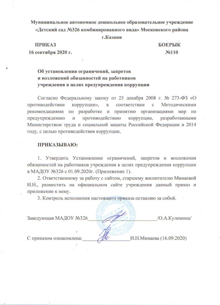 Приказ об установлении ограничений, запретов и возложений на работников учреждения в целях предупреждения коррупции