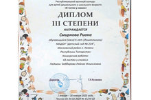 Воспитанница нашего детского сада, Смирнова Риана (6 лет), награждена Дипломом III степени за конкурсную работу в Республиканском заочном конкурсе для детей дошкольного и школьного возраста "В гостях у сказки", организованного в Республиканском олимпиадном центре при Министерстве образования и науки Республики Татарстан.