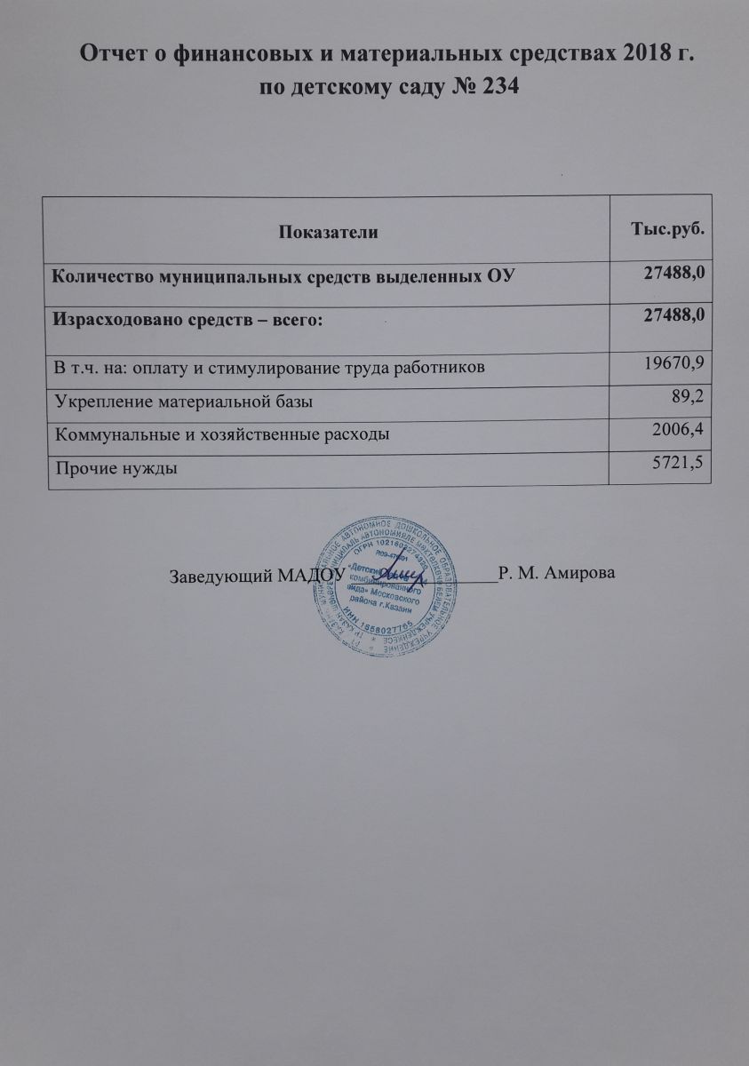 Отчет о финансовых и материальных средствах в МАДОУ №234 В 2018 году