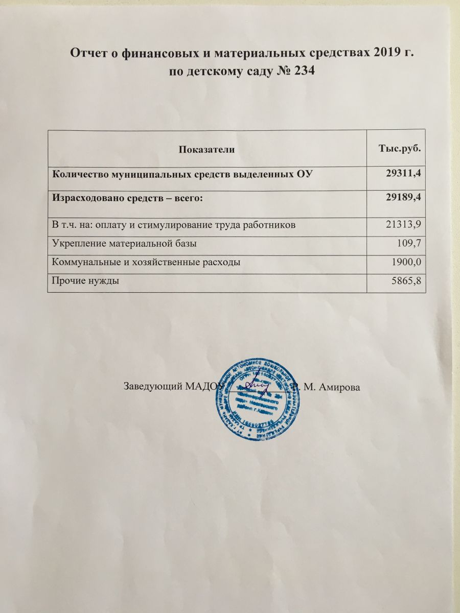 Отчёт о финансовых и материальных средствах в МАДОУ №234 в 2019 году