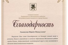 Администрация Кировского и Московского районов Исполнительного комитета города Казани выражает благодарность Фариде Миннулловне за большой личный вклад и плодотворный труд в деле воспитания и обучения детей дошкольного возраста!