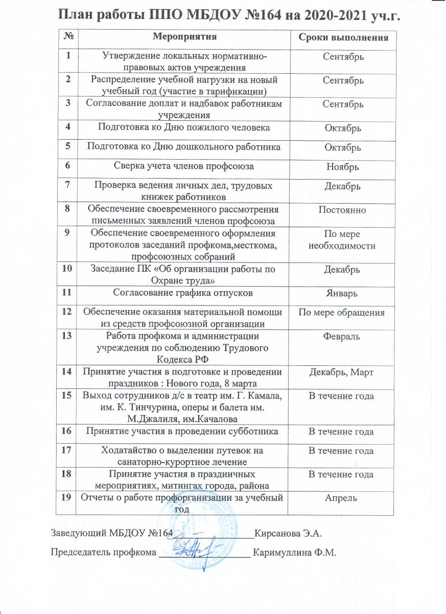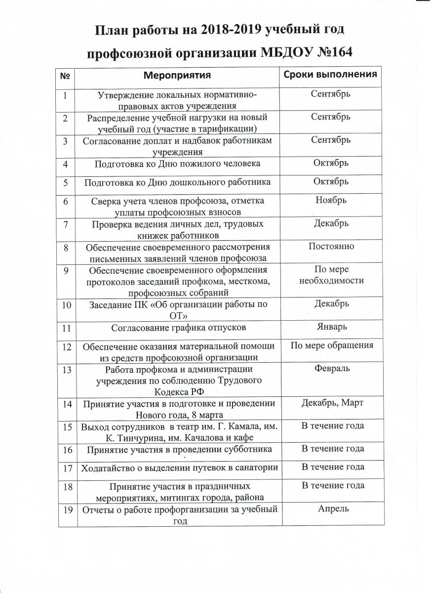 План работы профсоюзной организации МБДОУ № 164.