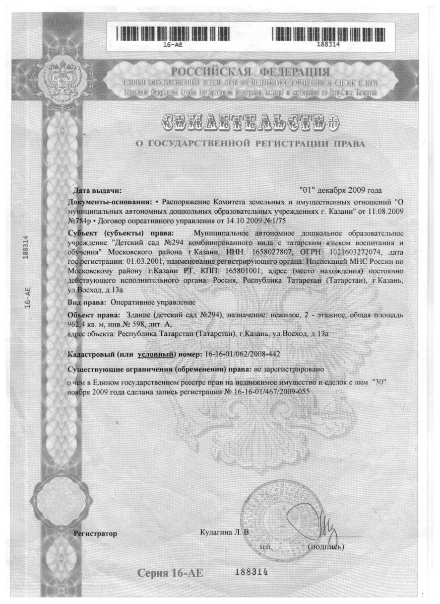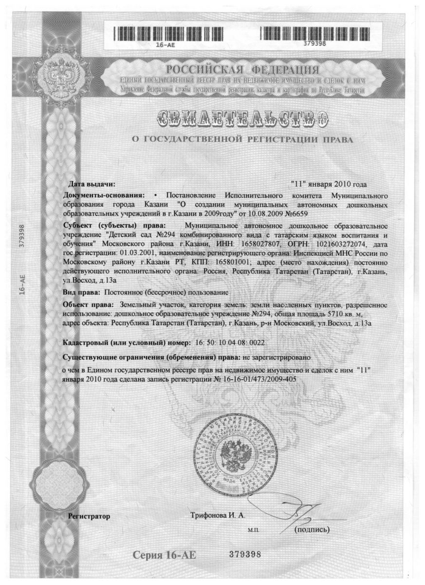 Короткое название: МАДОУ "Детский сад №294" Московского района г.Казани