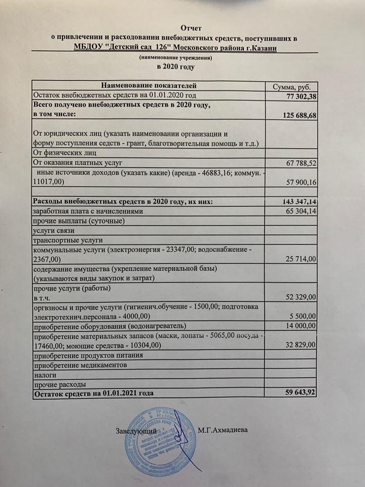 Отчёт о привлечении и расходовании внебюджетных средств поступивших в 2020 году