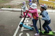Сегодня на прогулке состоялись веселые старты. Дети соревновались на самокатах.
