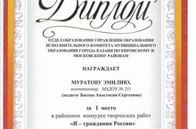 Поздравляем нашу воспитанницу Муратову Эмилию (средняя группа) (педагог - Басова Анастасия Сергеевна), занявшую 1 место в районном конкурсе творческих работ "Я-гражданин России". Умница! Так держать!!!