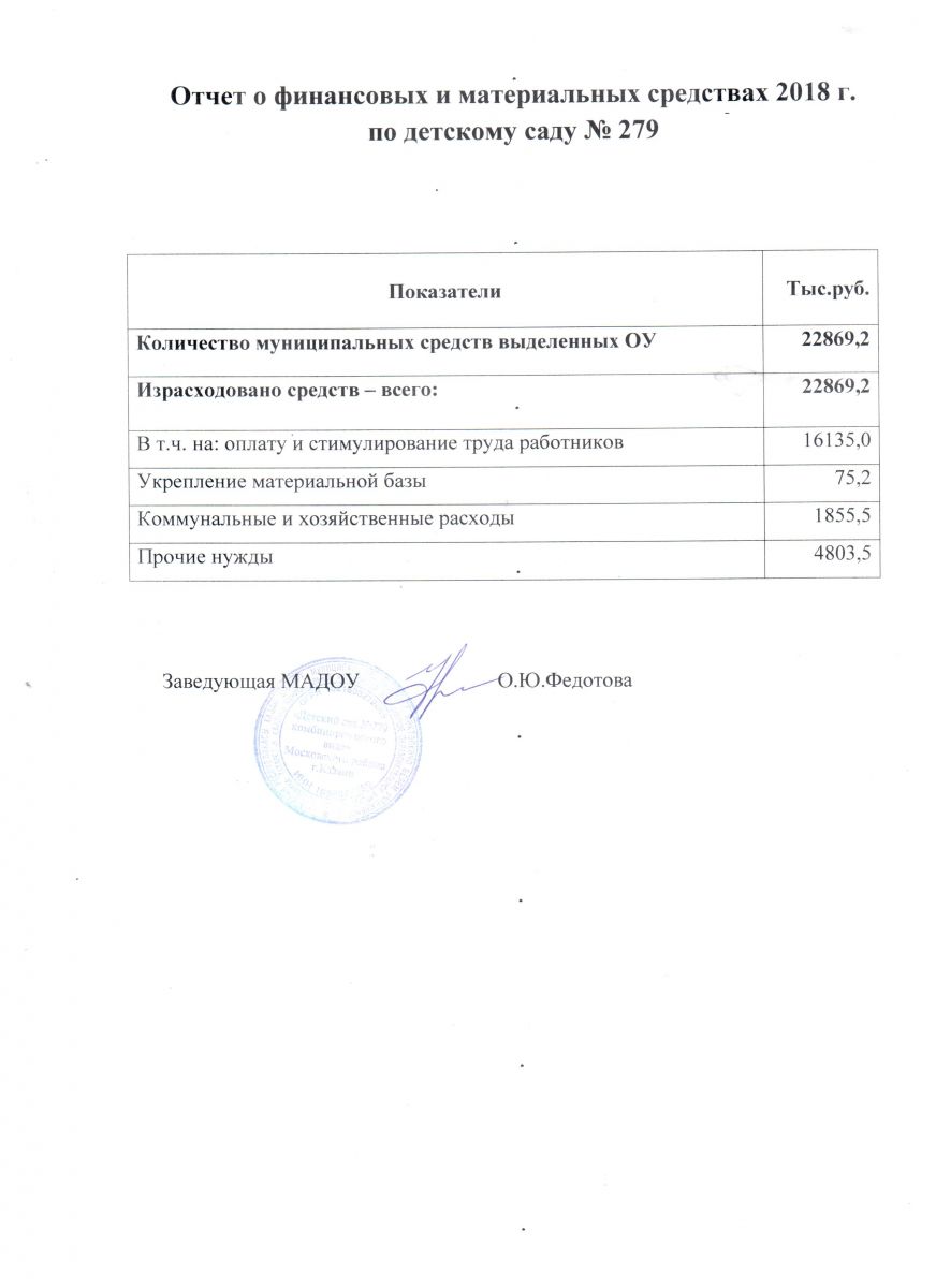 Отчет о финансовых и материальных средствах 2018г. по детскому саду № 279