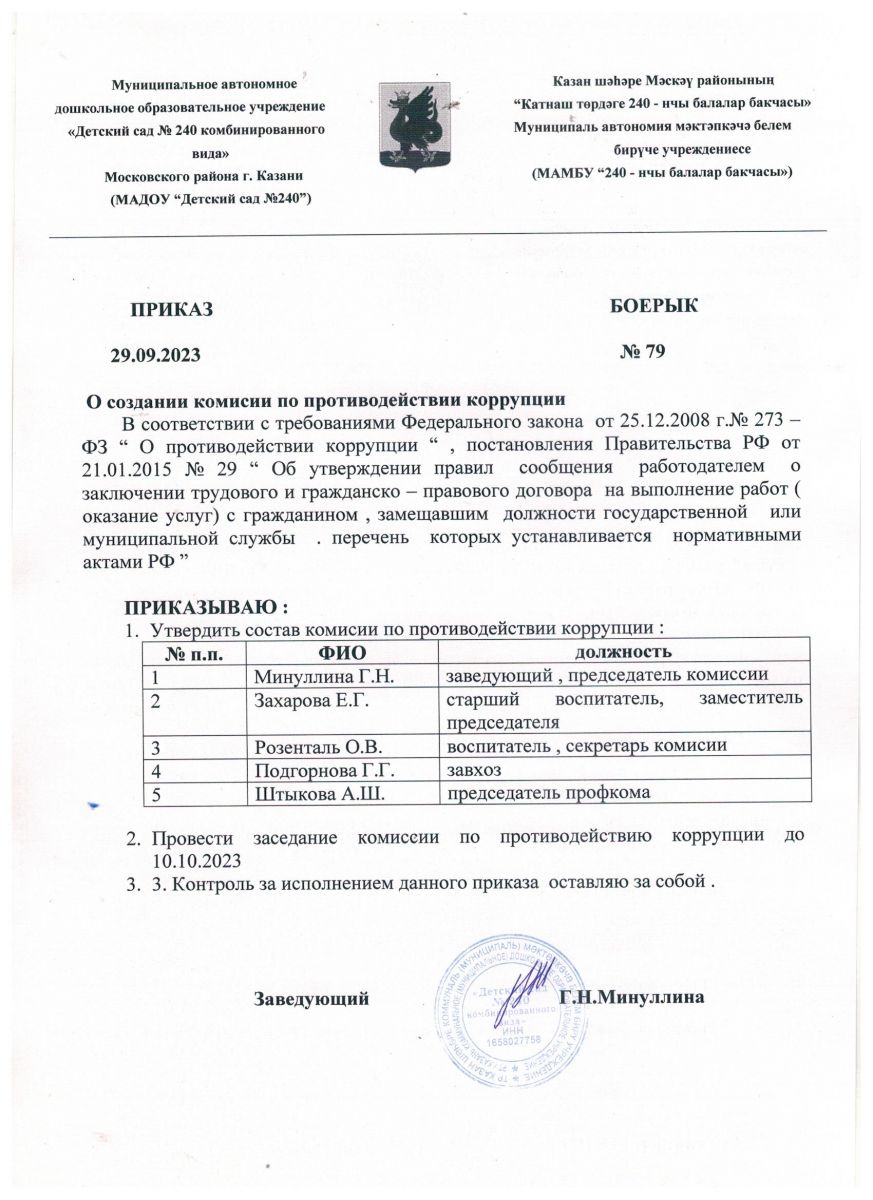 Приказ о создании комисии по противодействию коррупции в МАДОУ №240