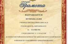 Поздравляем ученицу 9А класса Шумихину Юлию, достойно представляющую нашу школу во многих спортивных соревнованиях, с получением грамоты Отдела образования Кировского и Московского районов за 3 место в открытом районом первенстве по спортивному ориентированию.