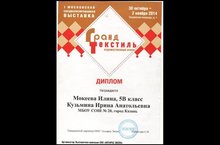 В дни осенних каникул учитель начальной школы Ирина Анатольевна Кузьмина вместе со своей ученицей Мокеевой Илиной стали участниками очного финала Международного конкурса «Текстильная страна», который проходил в Москве с 29 октября по 3 ноября 2014 года. Обе участницы достойно представили нашу школу и стали победительницами творческого конкурса интернет-сайта «Страна Мастеров» в номинации «Объёмная архитектура».