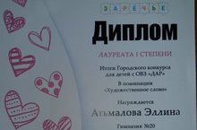 Поздравляем Агьмалову Эллину, ученицу 7а класса с победой в Городском конкурсе художественного творчества "ДАР", Эллина стала лауреатом I степени в номинации "Художественное слово", а также Лауреатом II степени в фестивале-конкурсе интегрального искусства "ЛУЧ-2021".