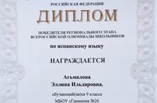 Поздравляем ученицу 9А класса Агьмалову Эллину с успешным выступлением на региональном этапе ВСОШ по испанскому языку! Эллина стала победителем регионального этапа ВСОШ по испанскому языку среди учащихся 9-11 классов!!! Желаем дальнейших успехов и побед!!!