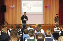 Весенняя Неделя добра началась с Урока Добра. В актовом зале перед учащимися 2-7-х классов выступили сотрудники Благотворительног фонда помощи бездомным животным "КОТ и ПЕС".