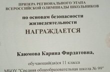 Поздравляем с получение призового места Каюмову Карину и педагога-организатора ОБЖ Кайнова А.В. в региональном этапе всероссийской олимпиаде школьников по ОБЖ!