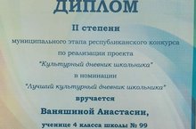 Поздравляем Ваняшину Анастасию ученицу 4 Б класса, занявшую II место в муниципальном этапе республиканского конкурса по реализации проекта "Культурный дневник школьника"!