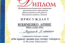 Поздравляем Юхименко Арину с Почетной грамотой 3-й степени в районном конкурсе чтецов «Он правду людям под гитару говорил»