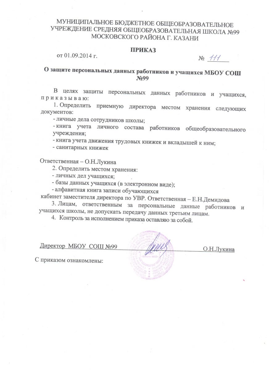 О защите персональных данных работников и учащихся МБОУ СОШ №99