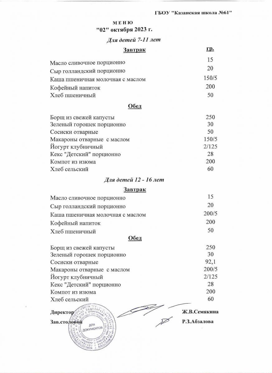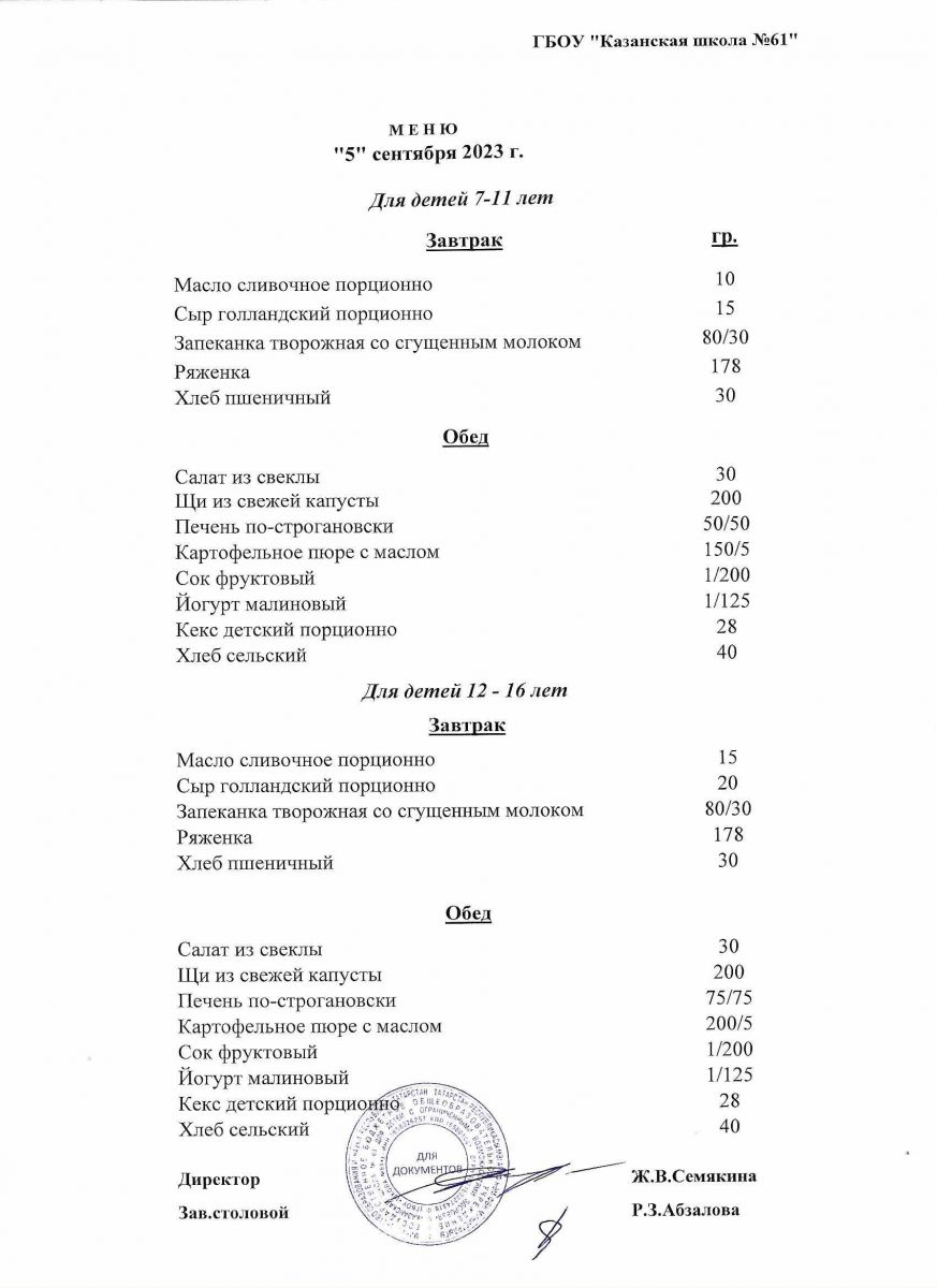 Меню на период с 2 по 6 сентября 2022 г.