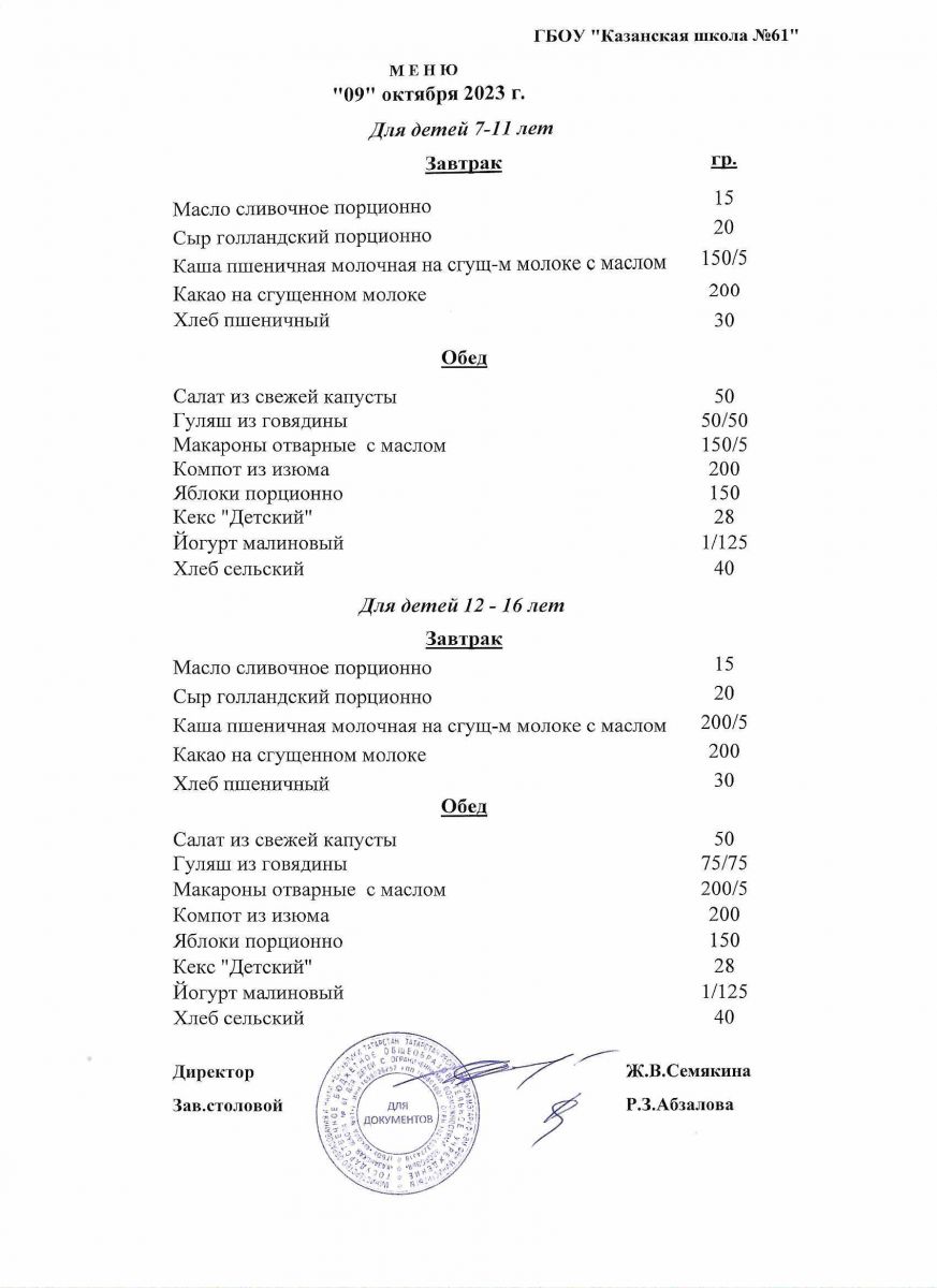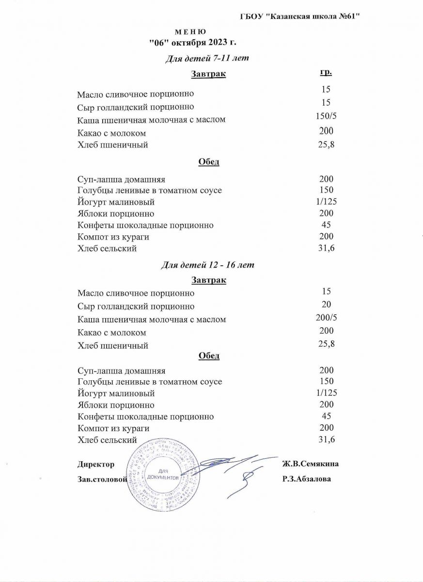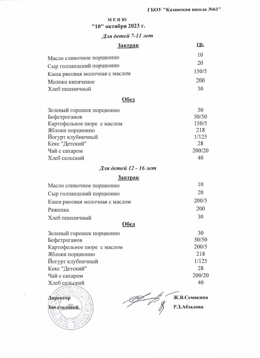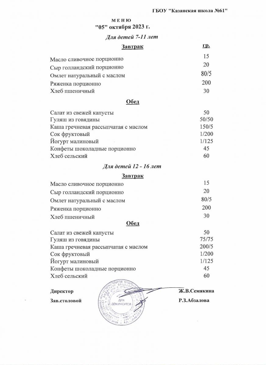 Меню на период с 5 по 10 октября 2022 г.