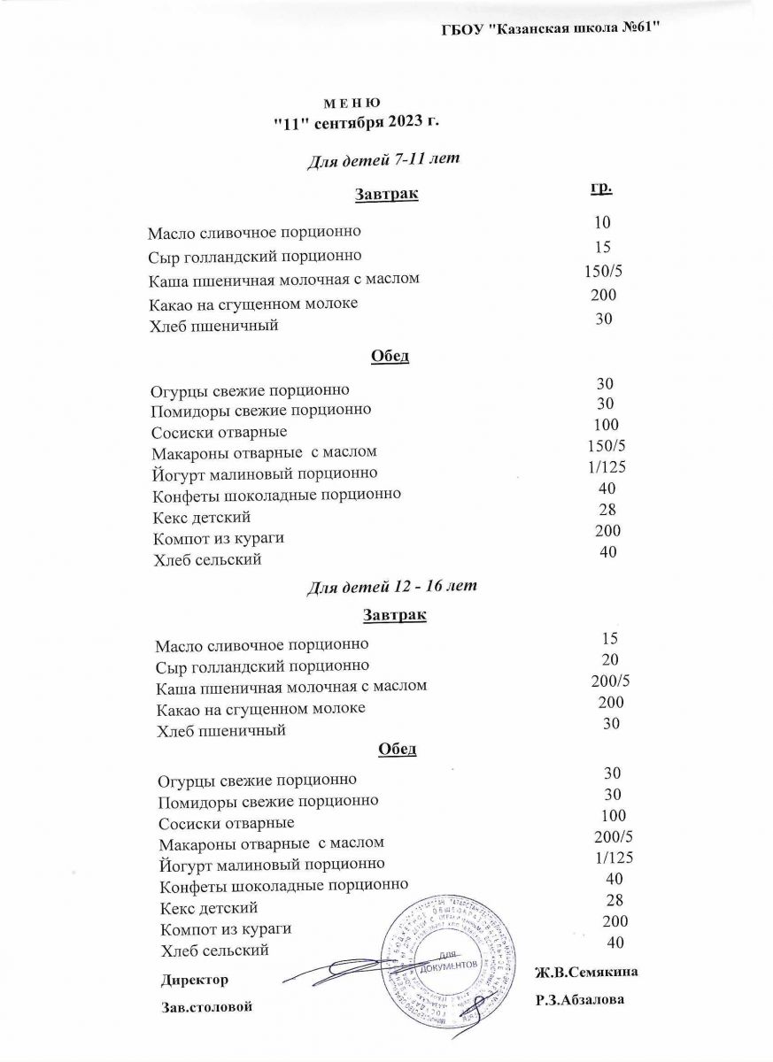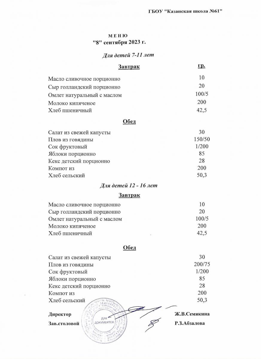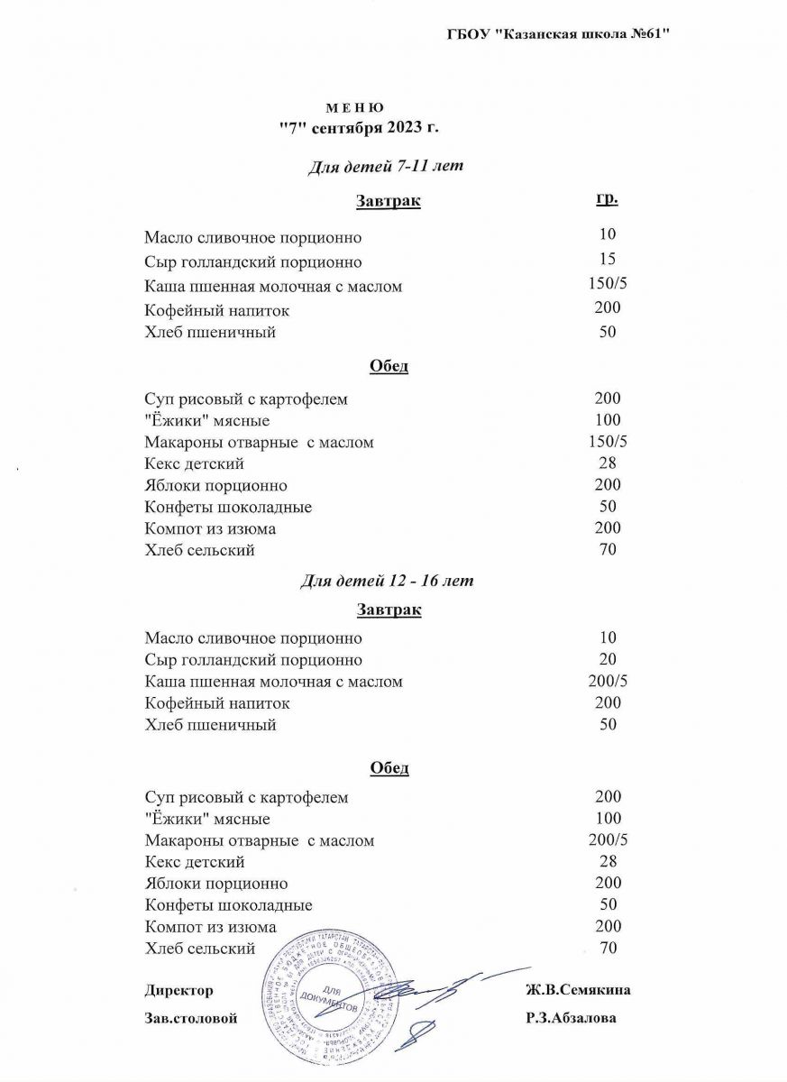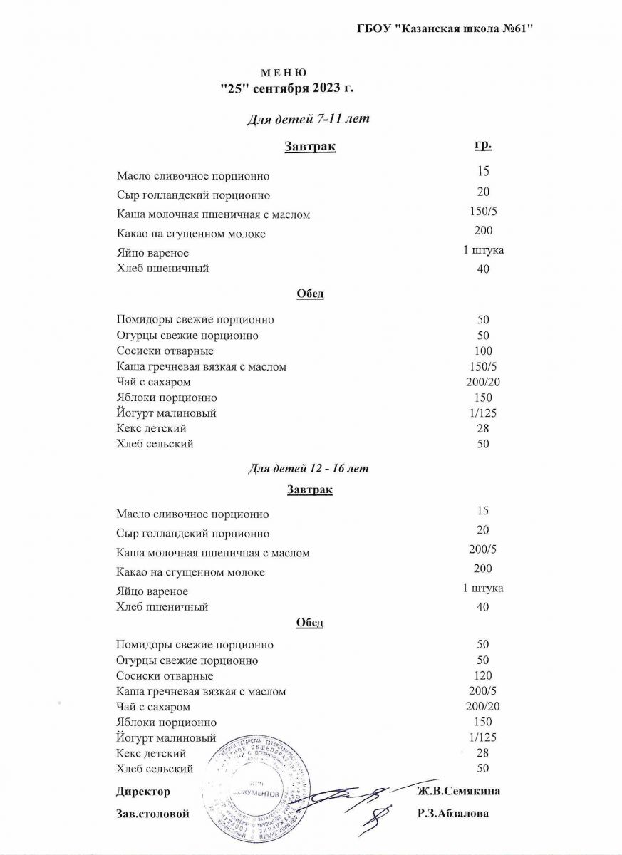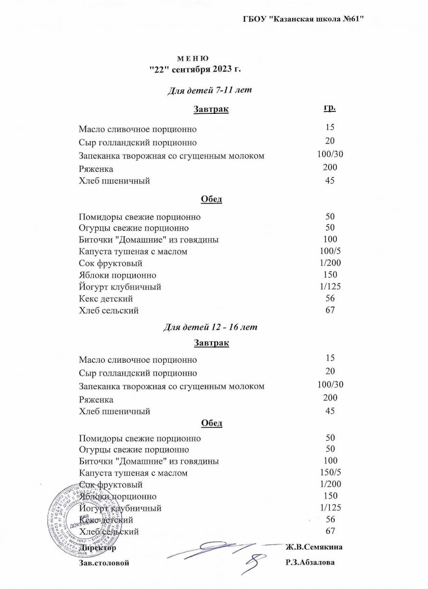 Меню на период с 7 по 13 сентября 2022 г.