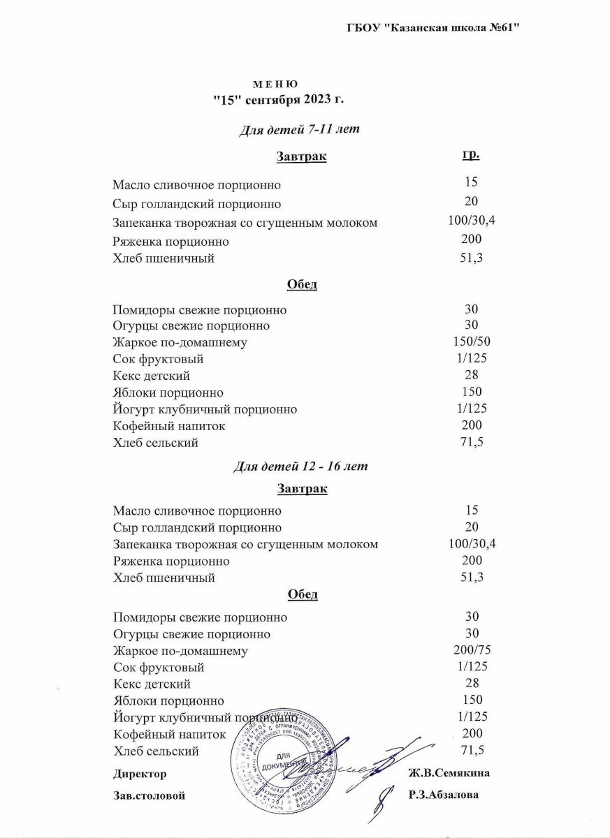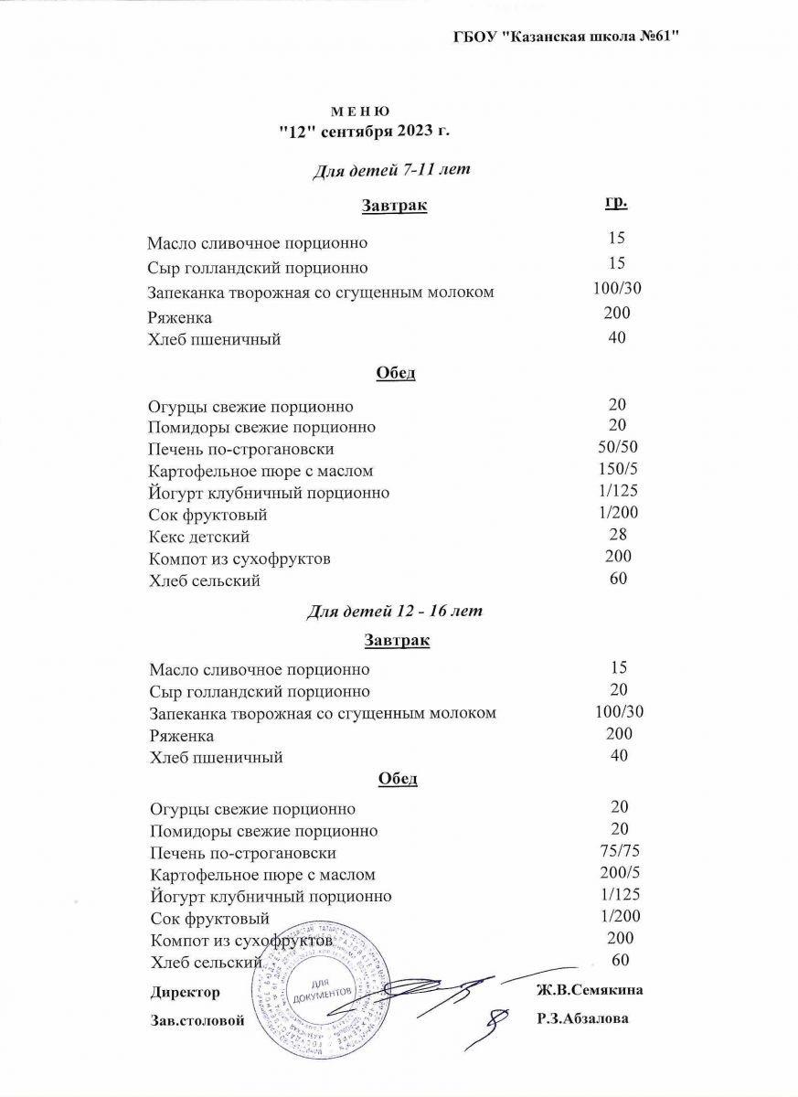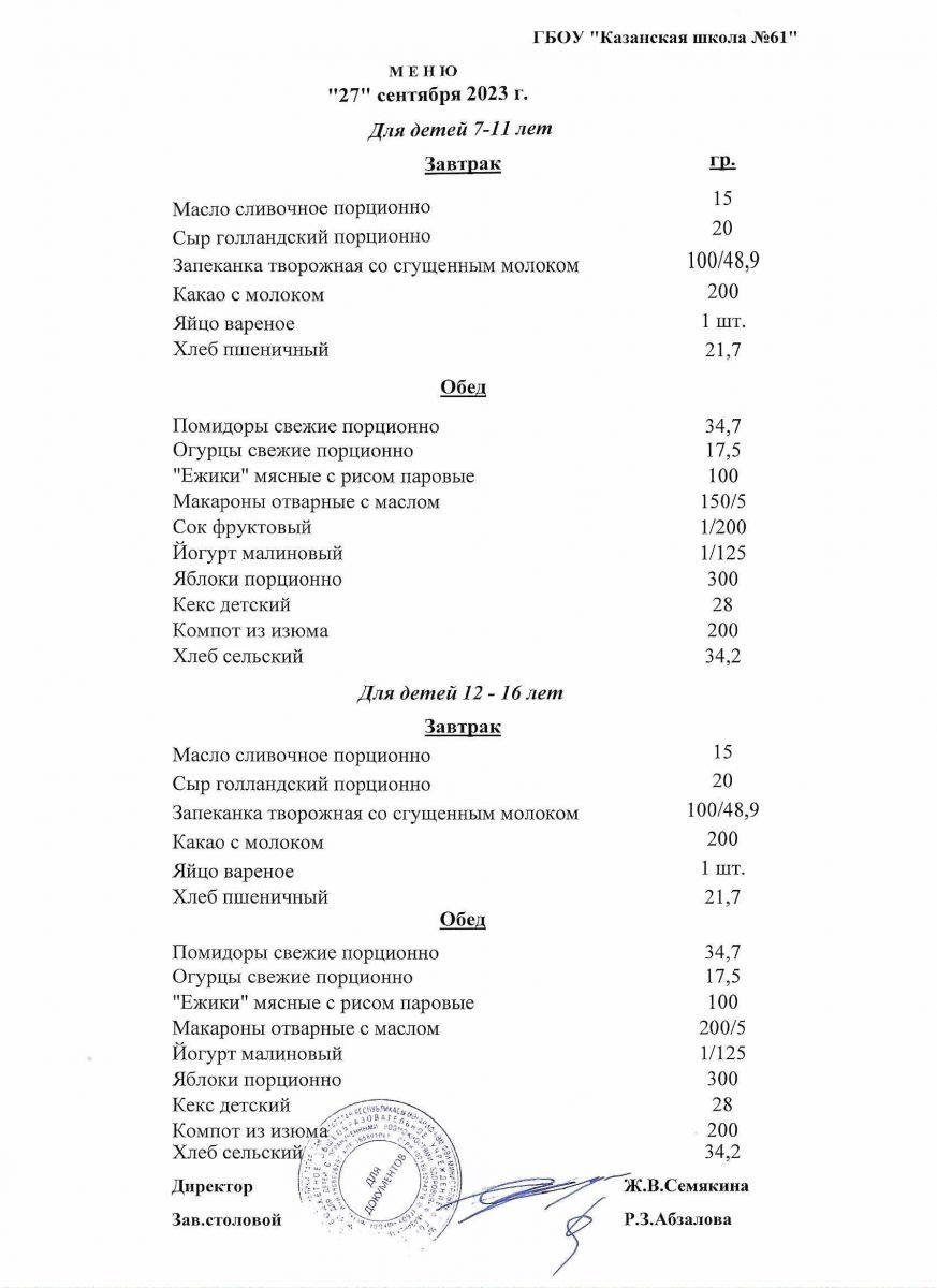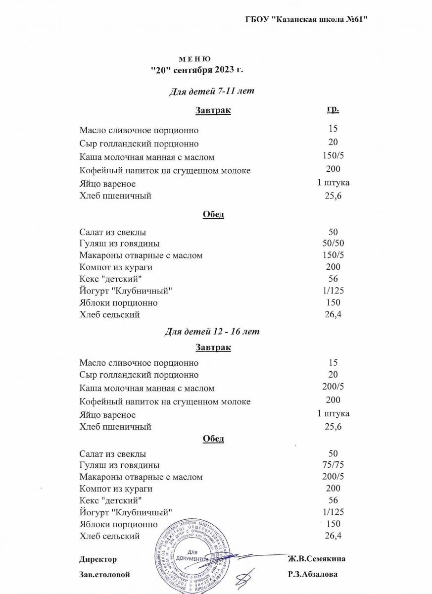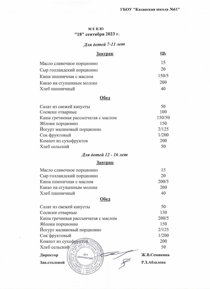 Меню на период с 7 по 13 сентября 2022 г.
