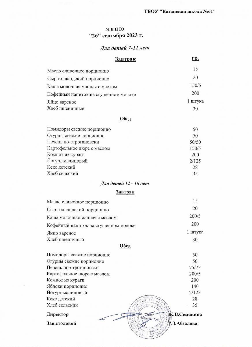 Меню на период с 26 по 27 сентября 2022 г.