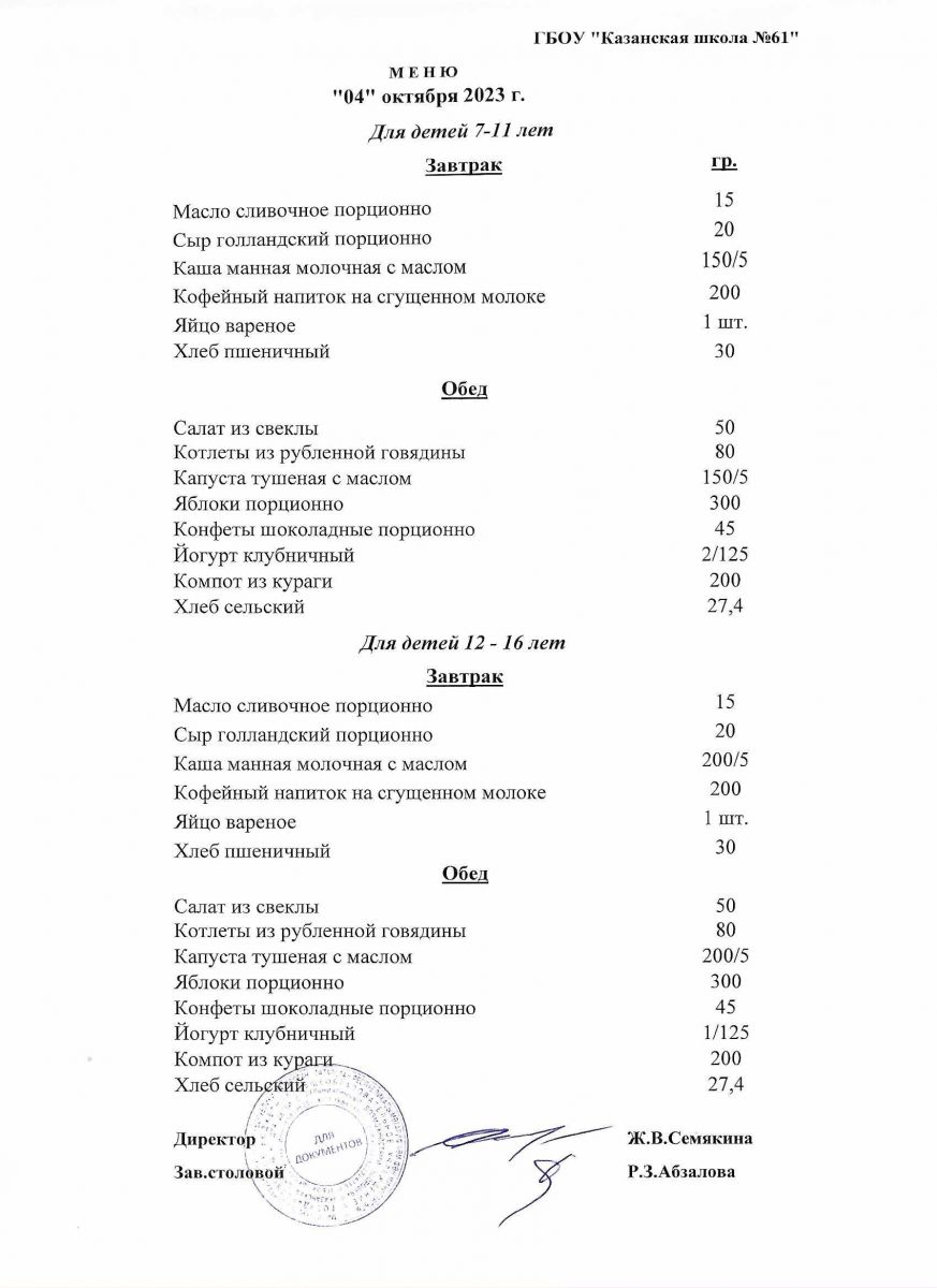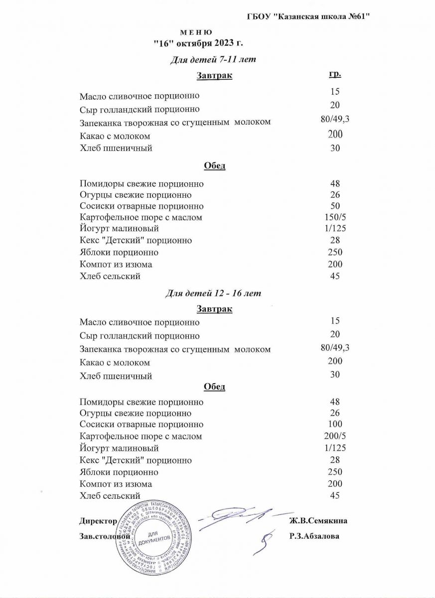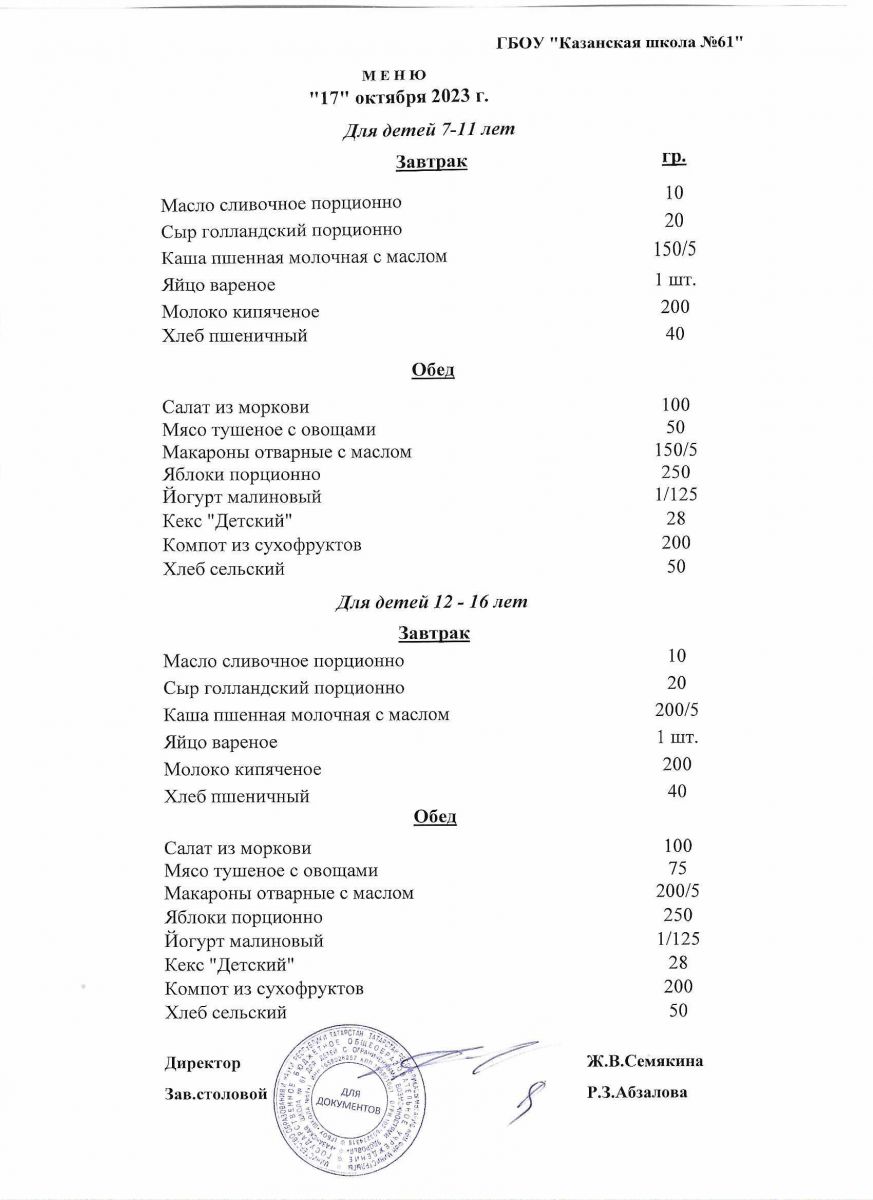 Меню на период с 14 по 17 октября 2022 г.