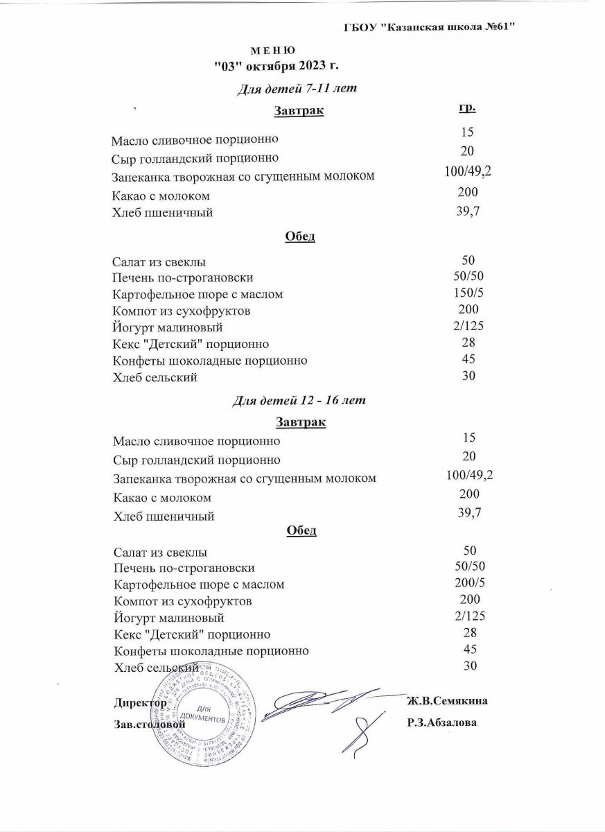 Меню на период с 3 по 4 октября 2022 г.