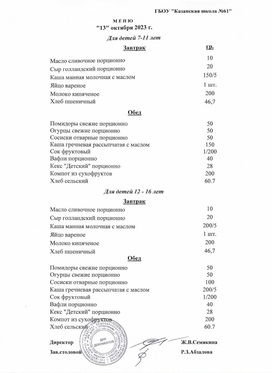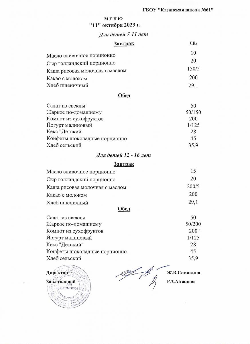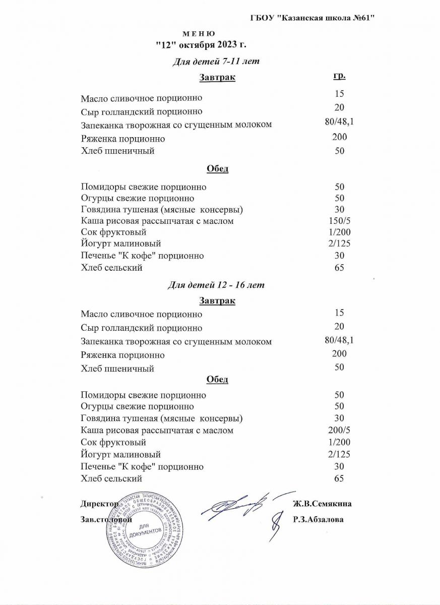 Меню на период с 11 по 13 октября 2022 г.
