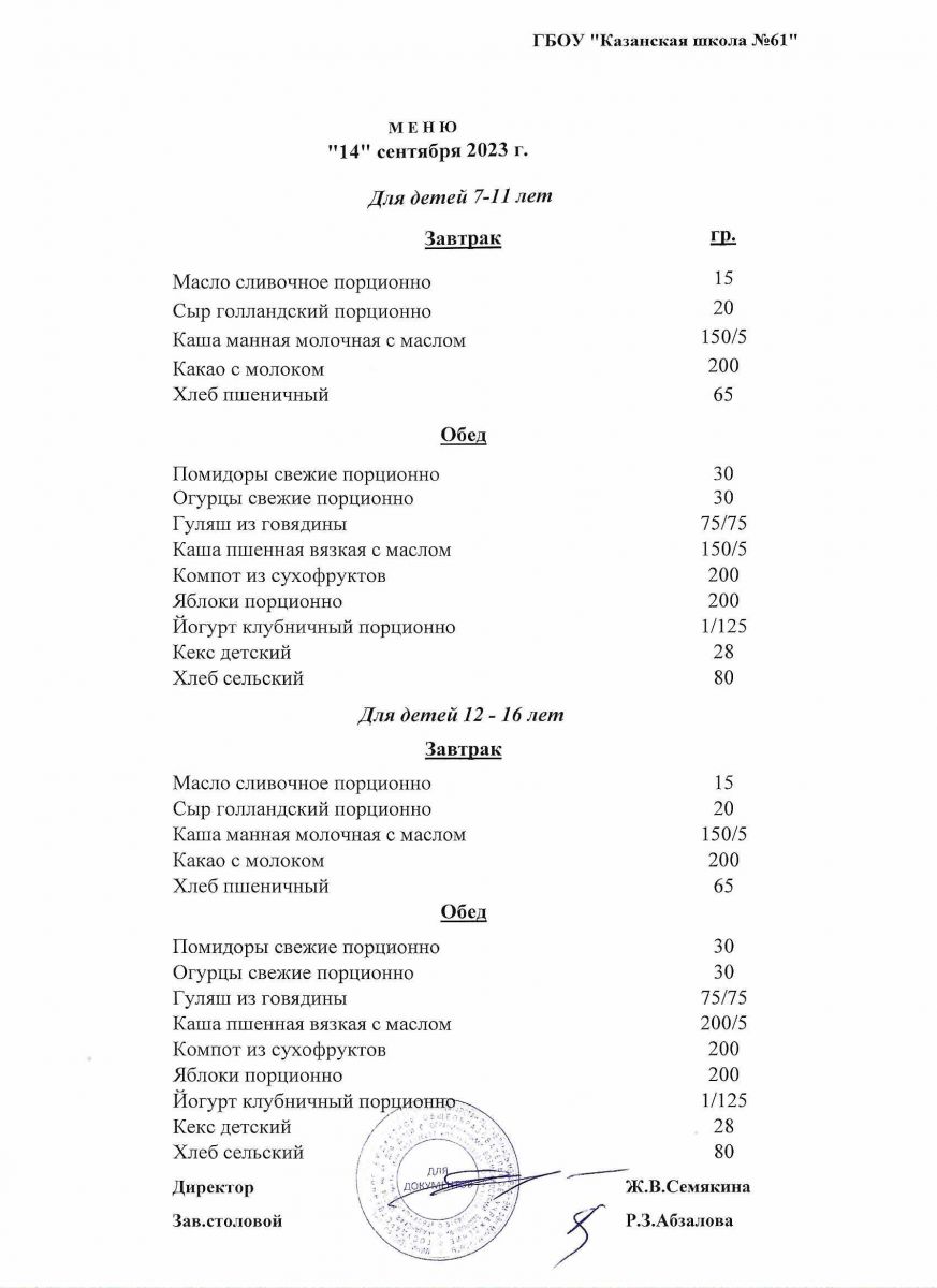 Меню на период с 14 по 16 сентября 2022 г.