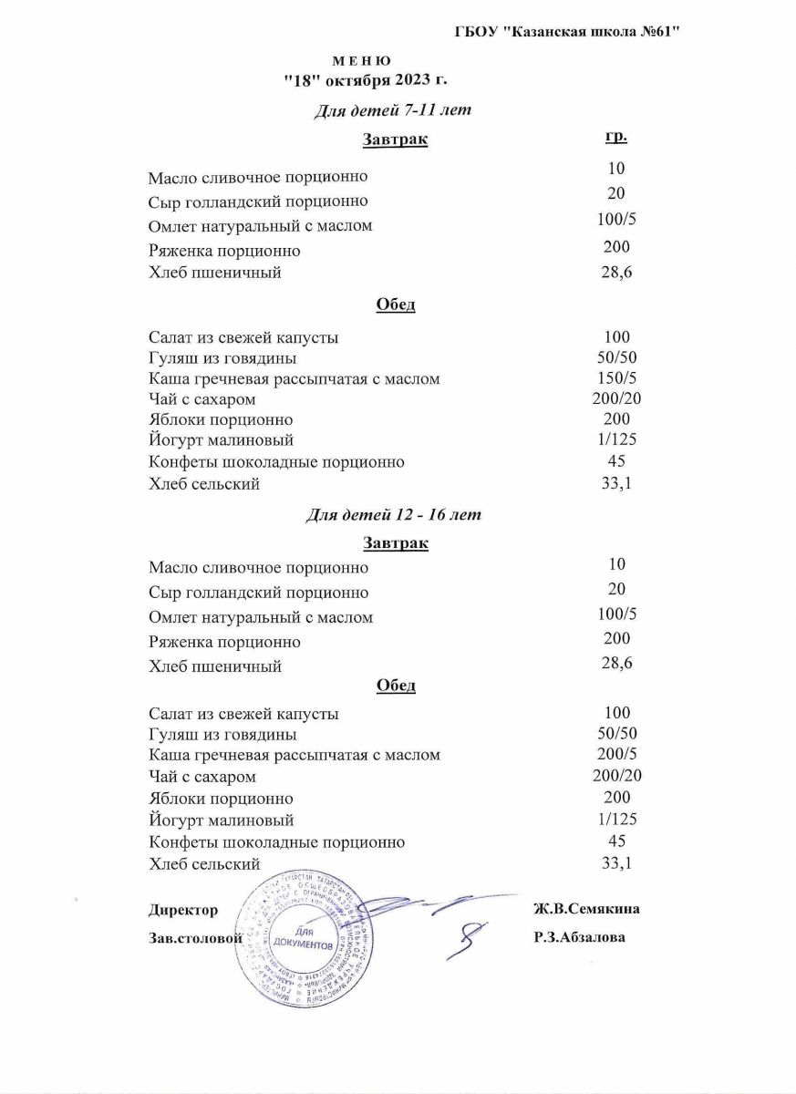 Меню на период с 18 по 25 октября 2022 г.