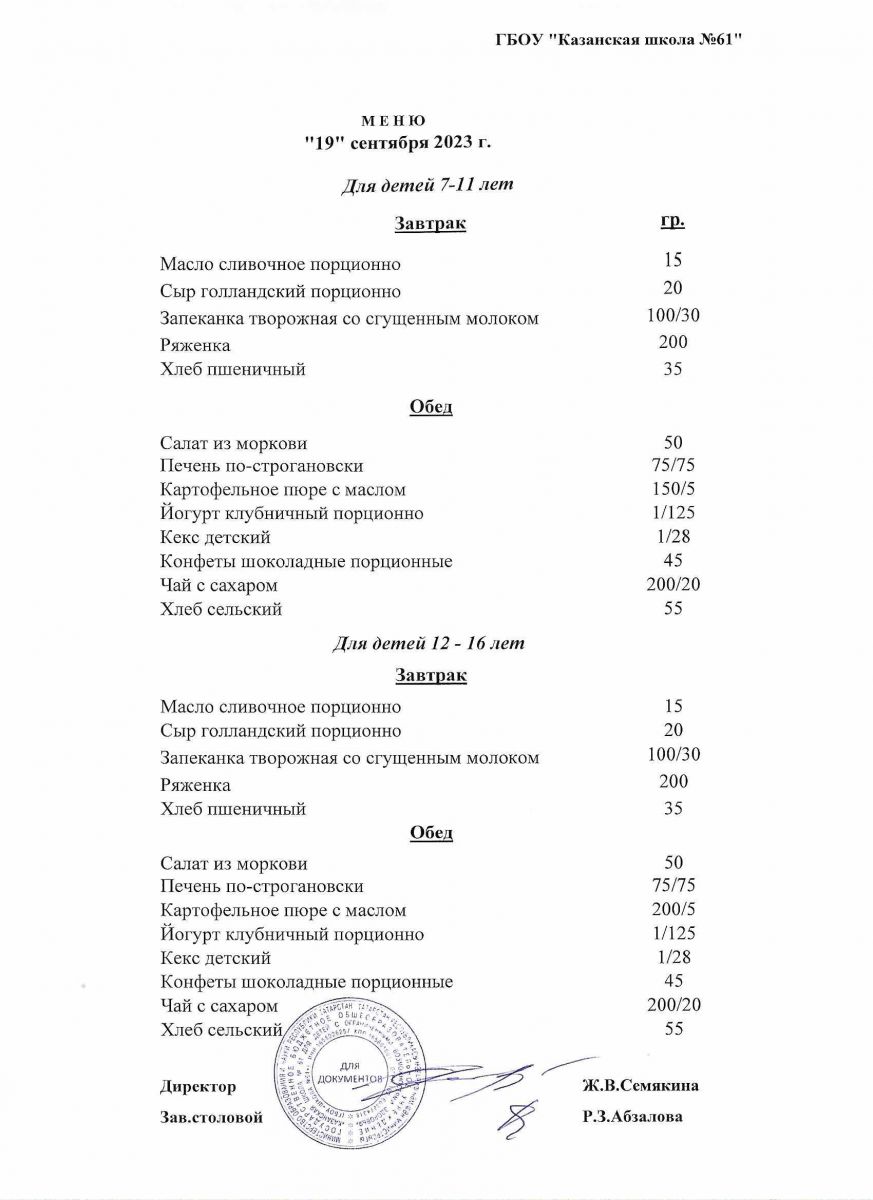 Меню на период с 19 по 20 сентября 2022 г.