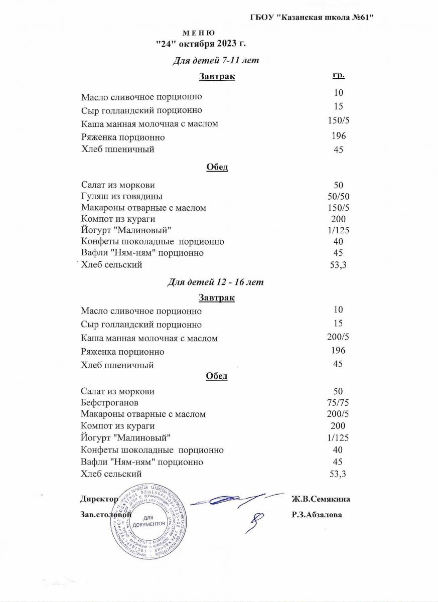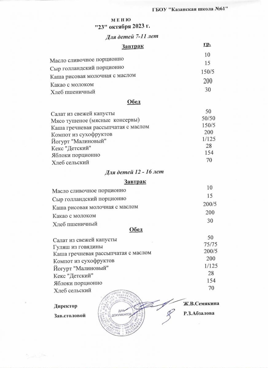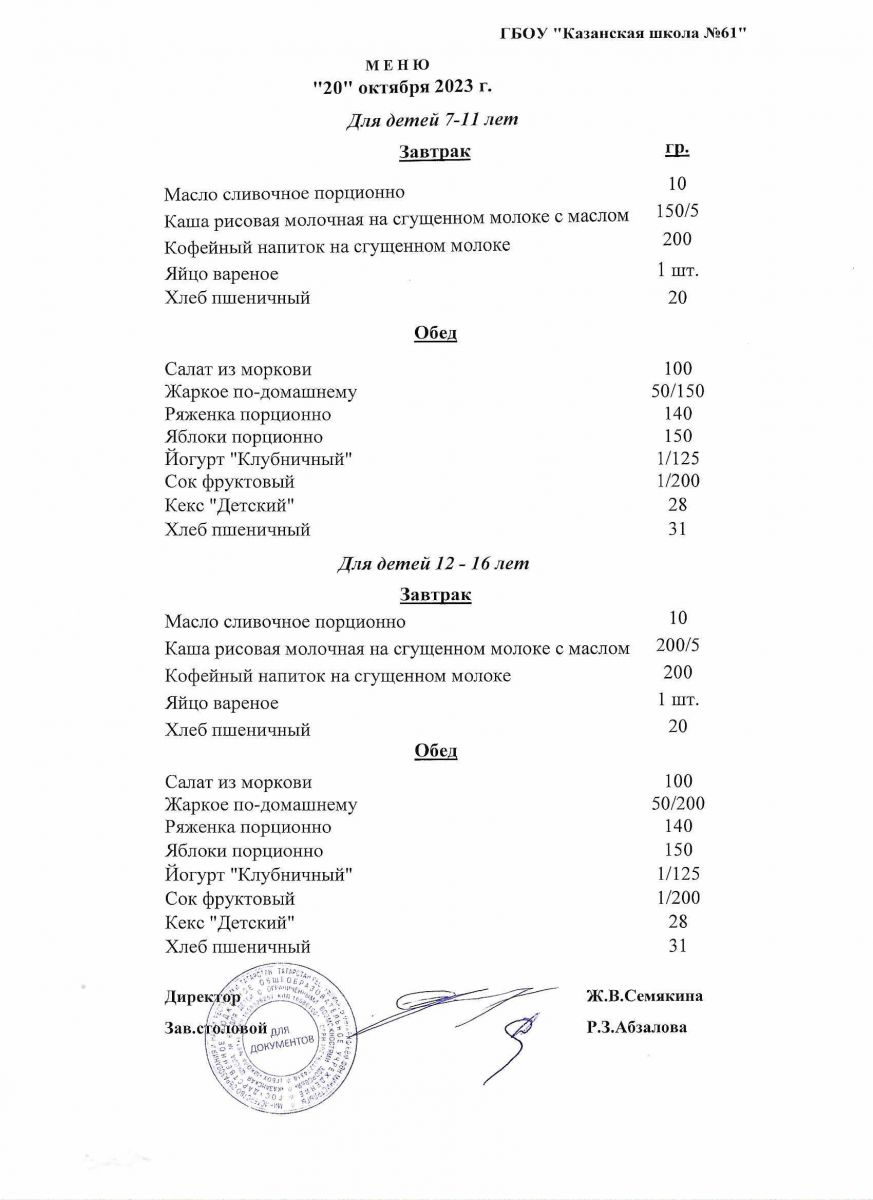 Меню на период с 23 по 28 октября 2020 г.