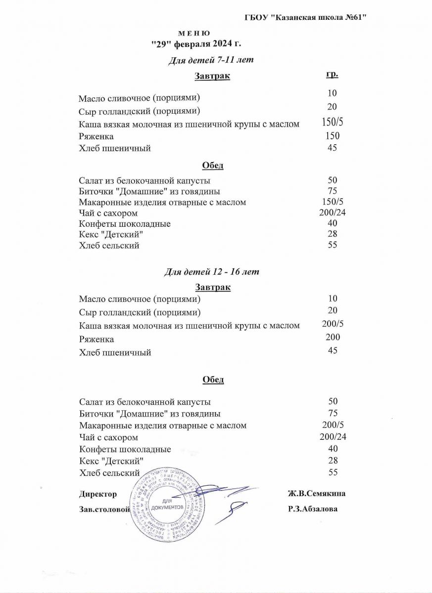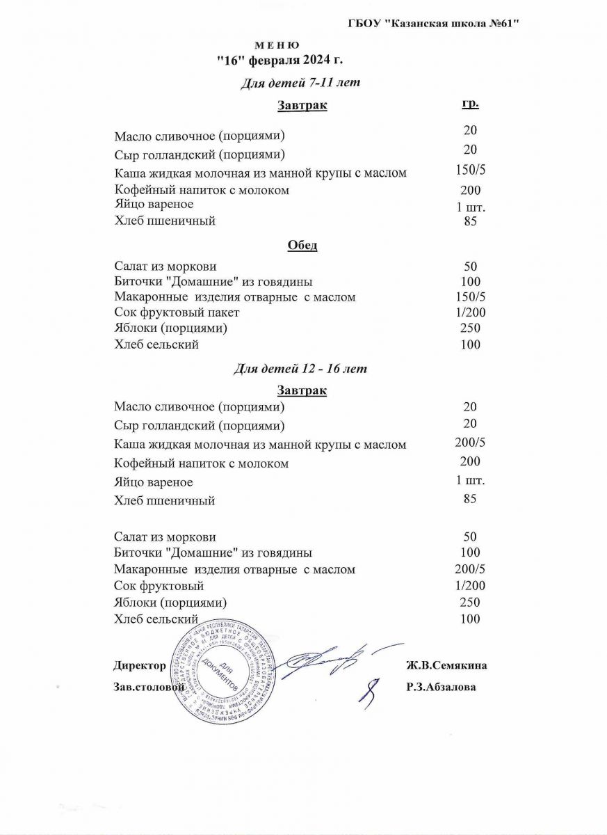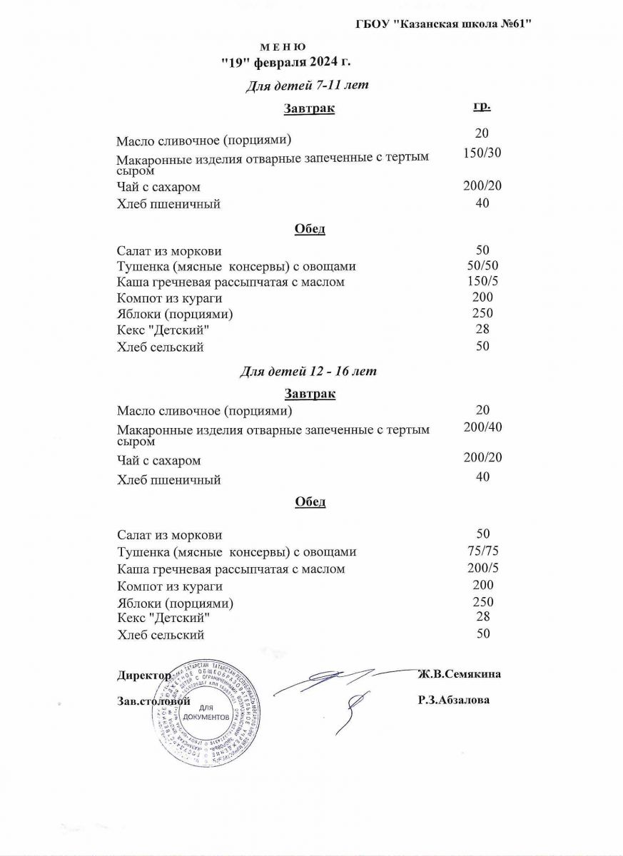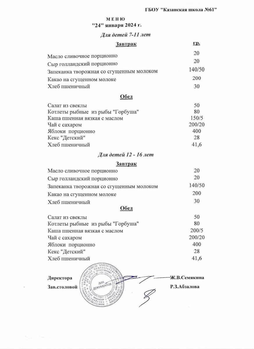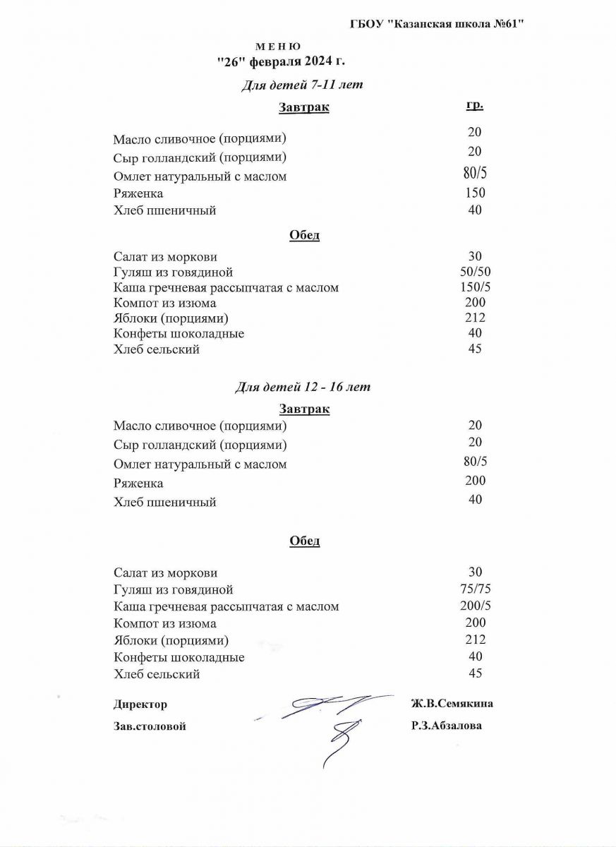 Меню на период с 24 по 26 февраля 2021 г.