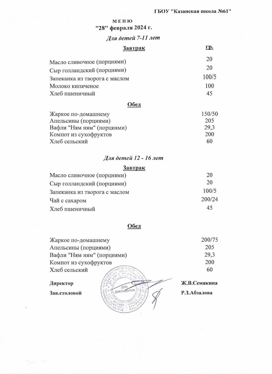 Меню на период с 20 по 28 февраля 2023 г