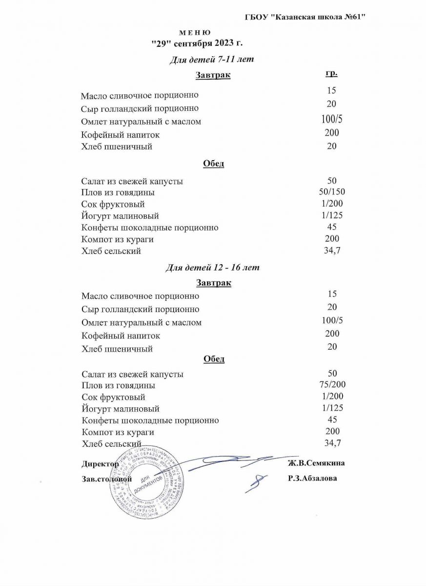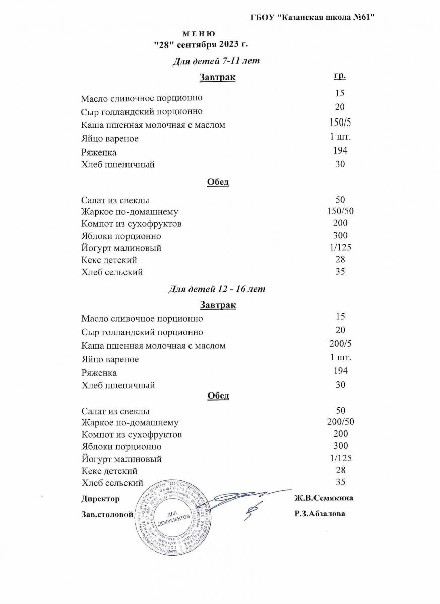Меню на период с 28 по 30 сентября 2022 г.