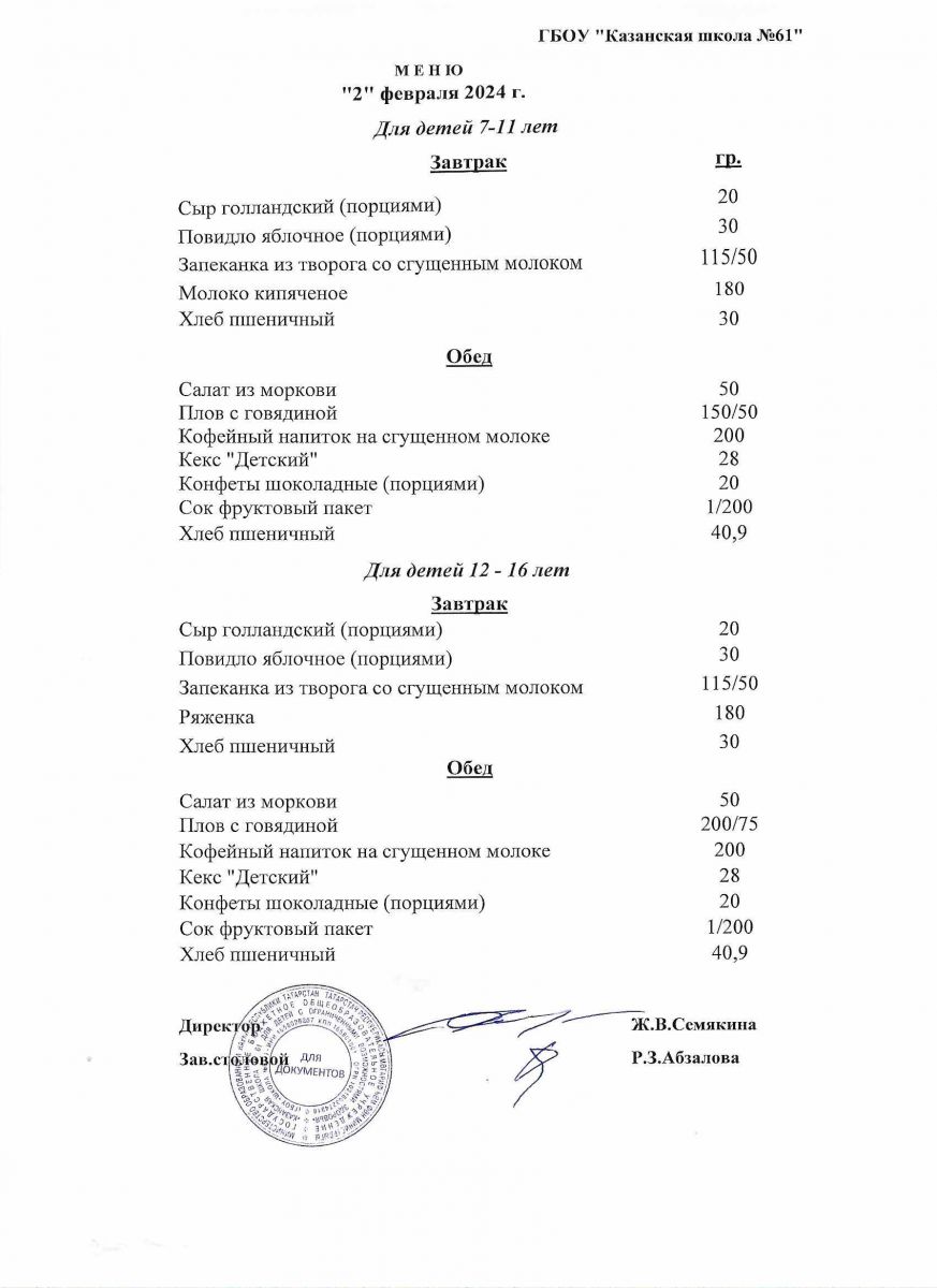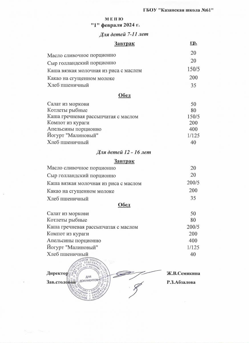 Меню на период с 1 по 6 февраля 2023 г.