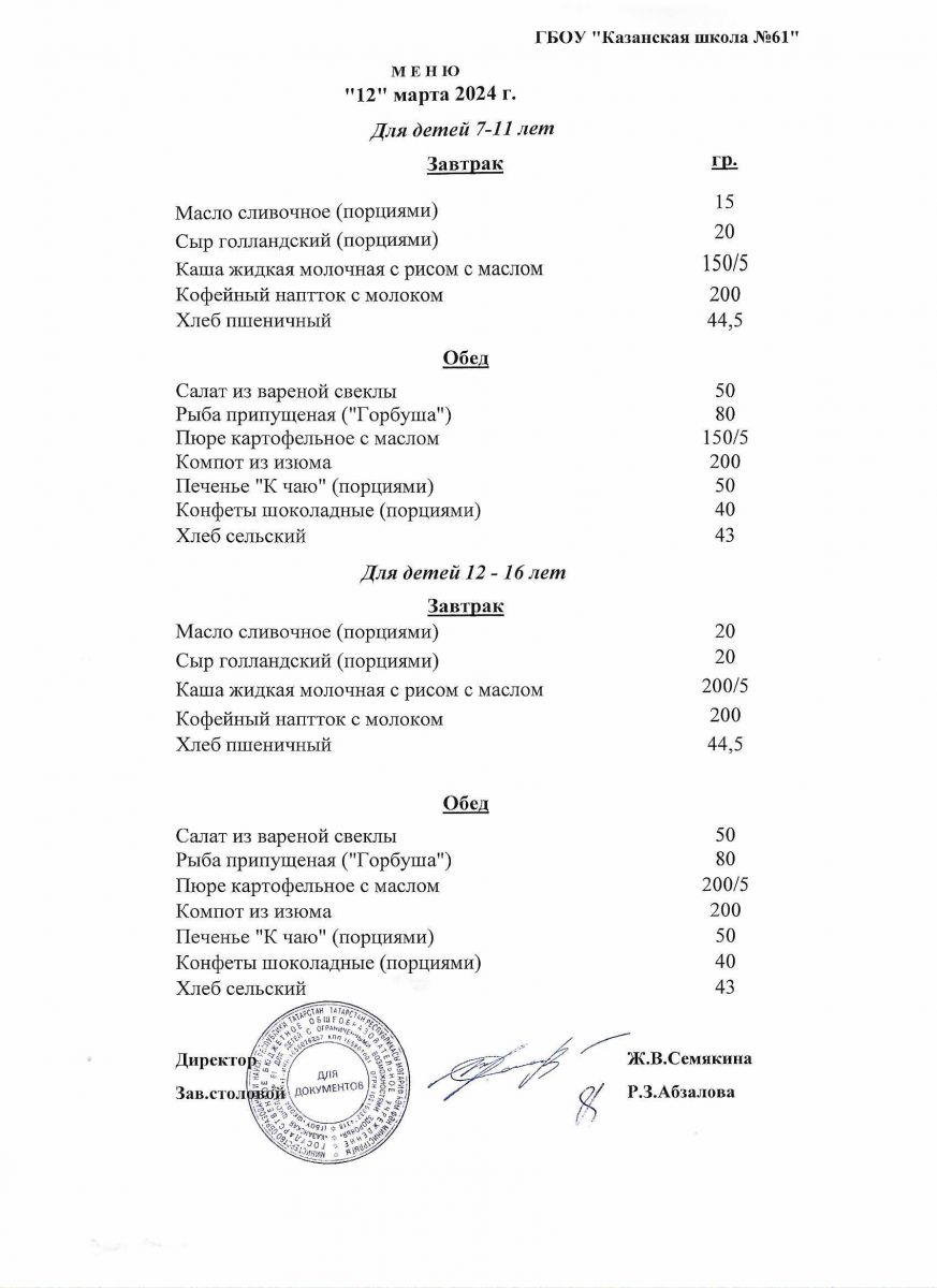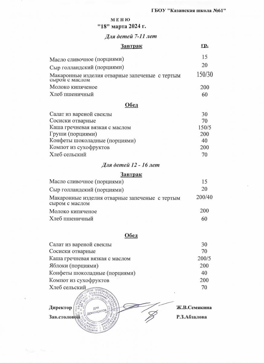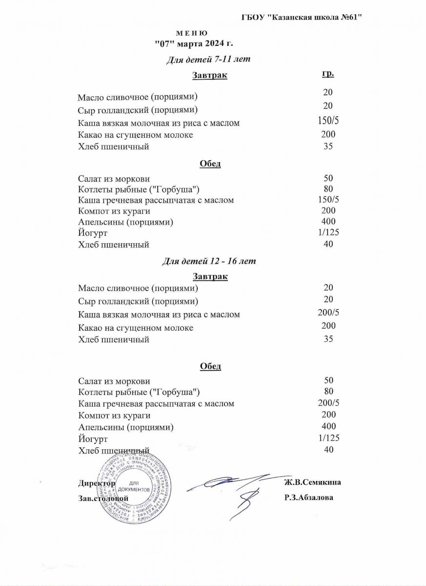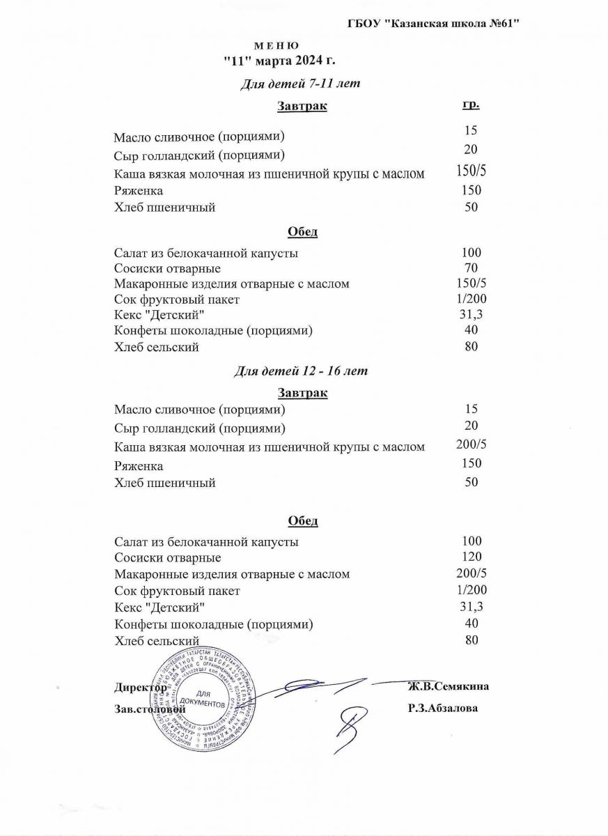 Меню на период с 7 по 10 марта 2023 г