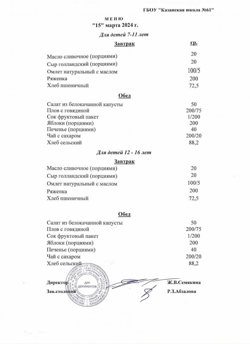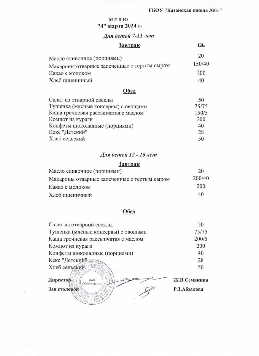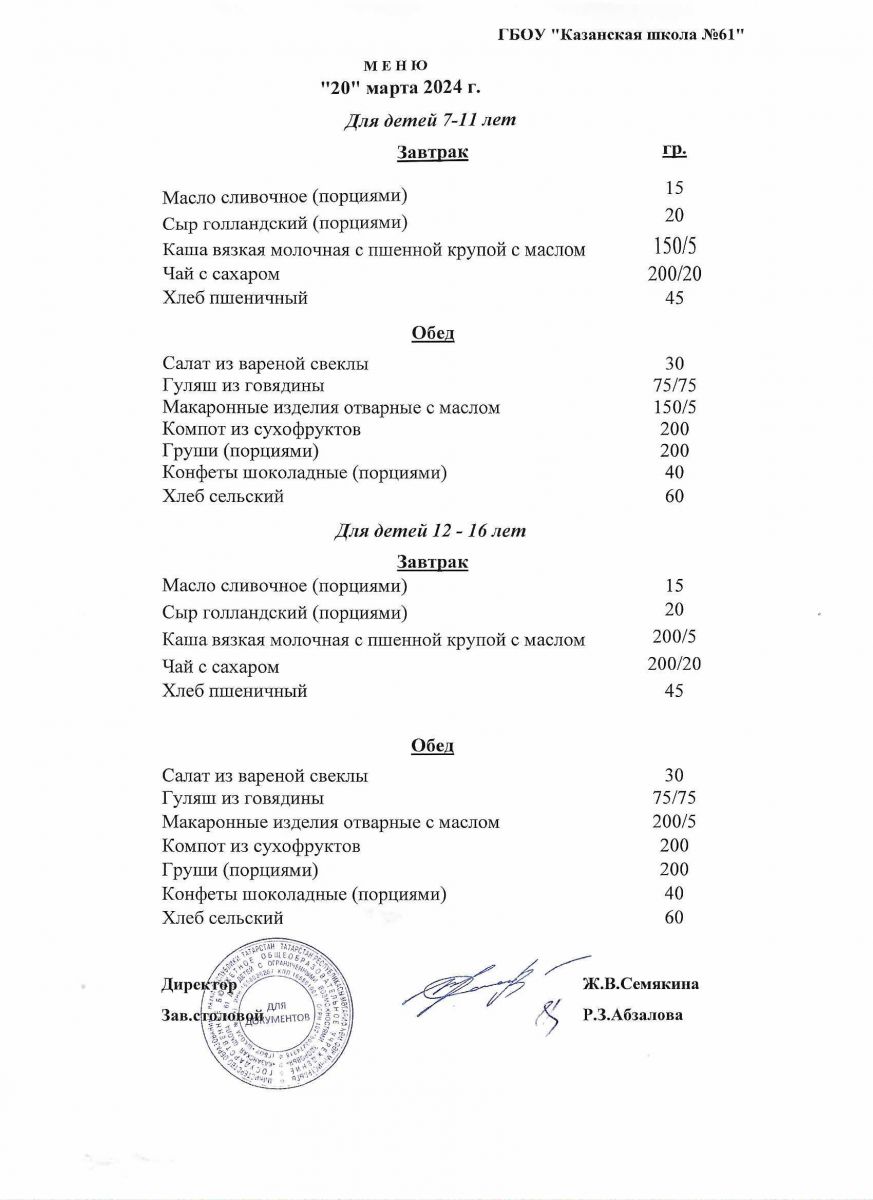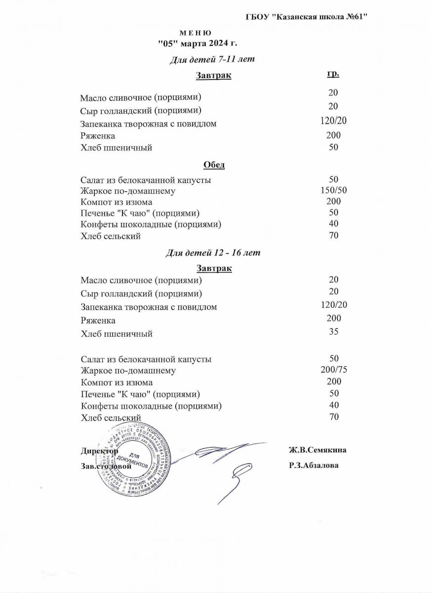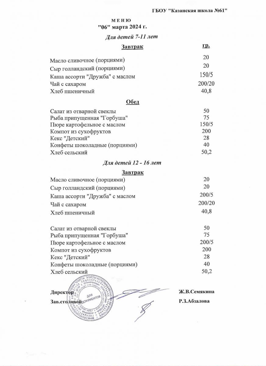 Меню на период с 7 по 10 марта 2023 г