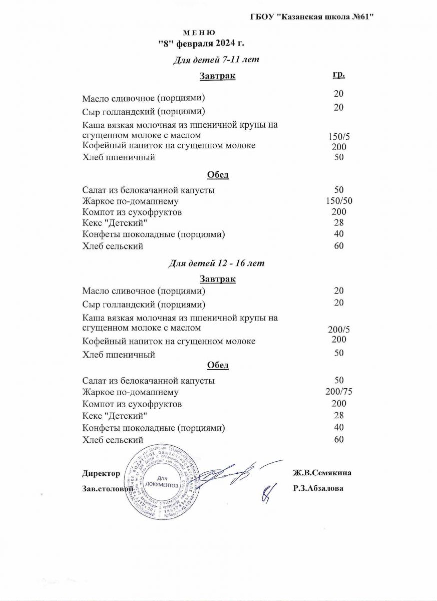 Меню на период с 8 по 12 февраля 2021 г.