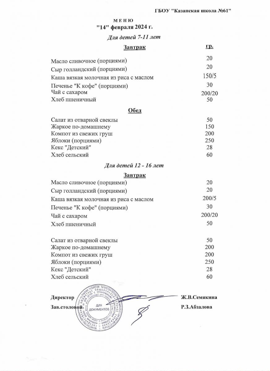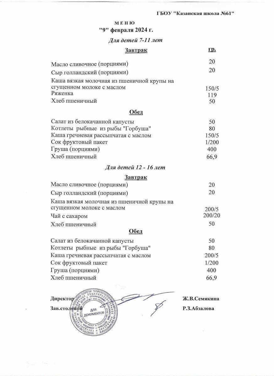 Меню на период с 7 по 10 февраля 2023 г