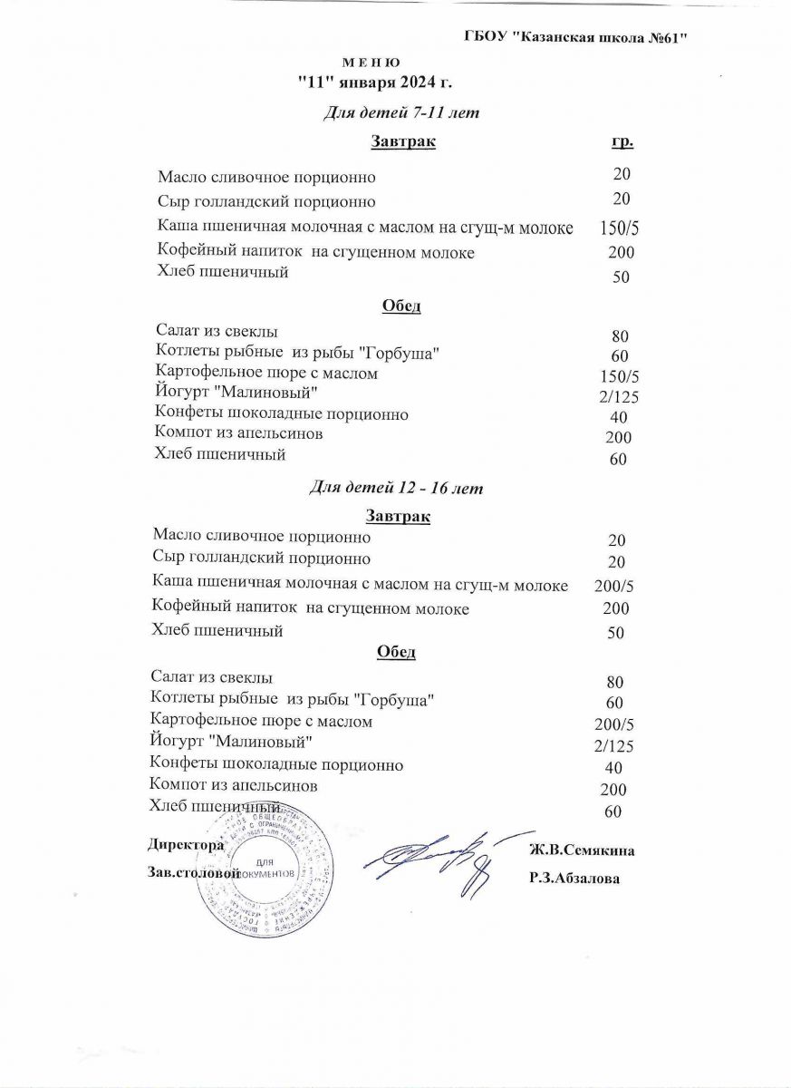 Меню на период с 11 по 15 января 2021 г.