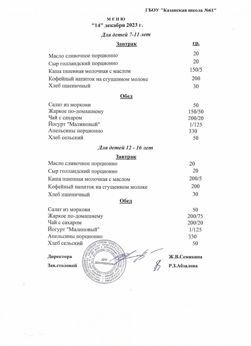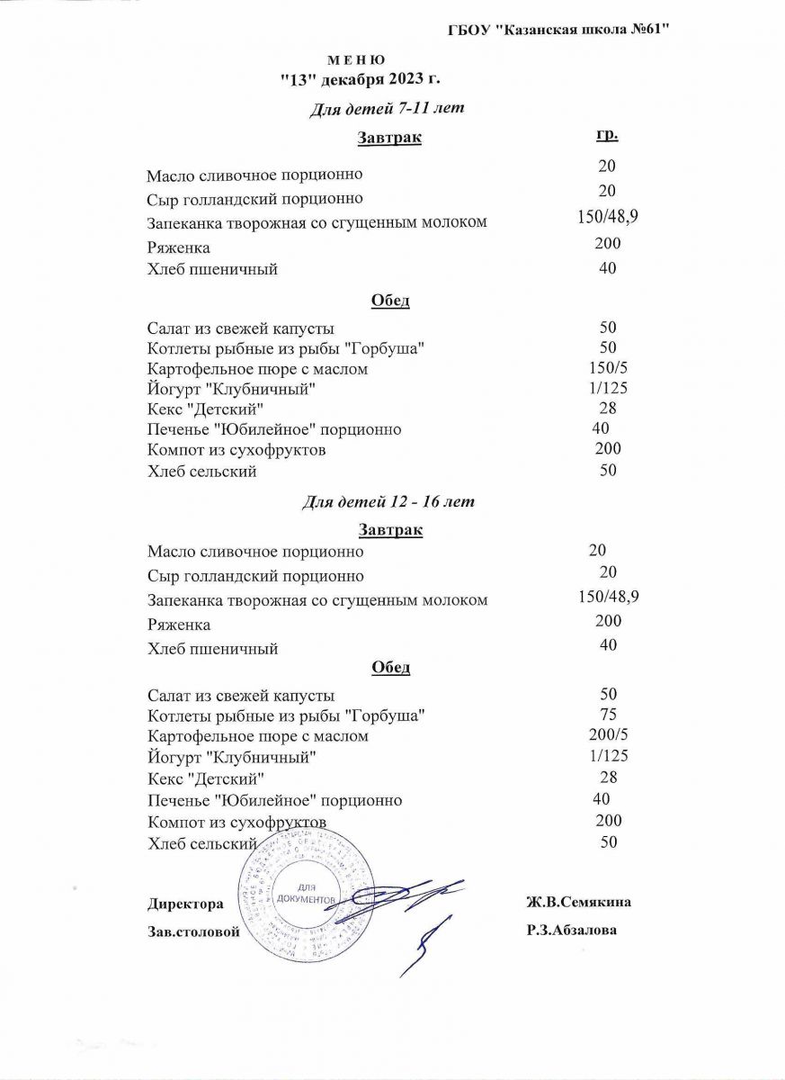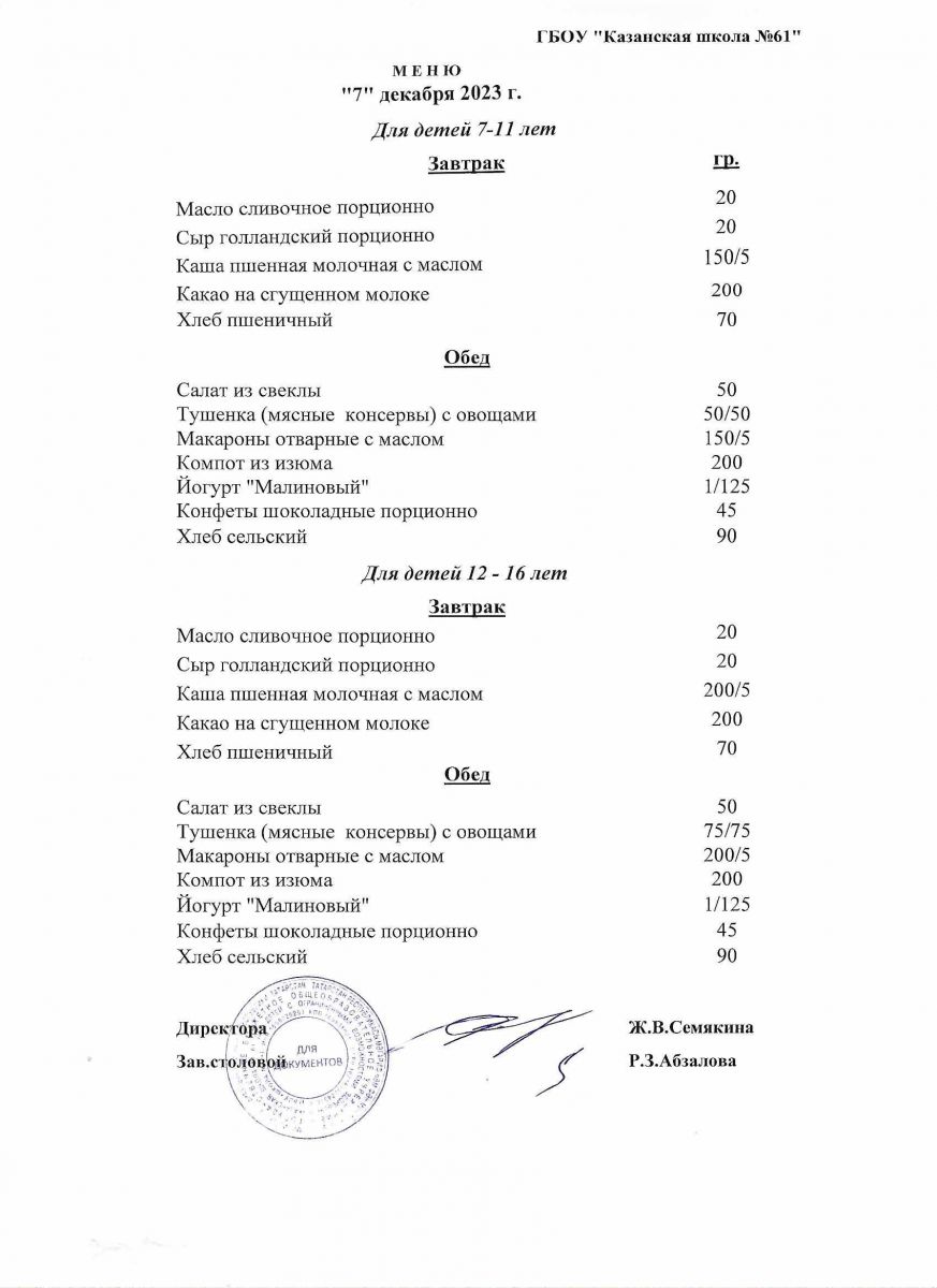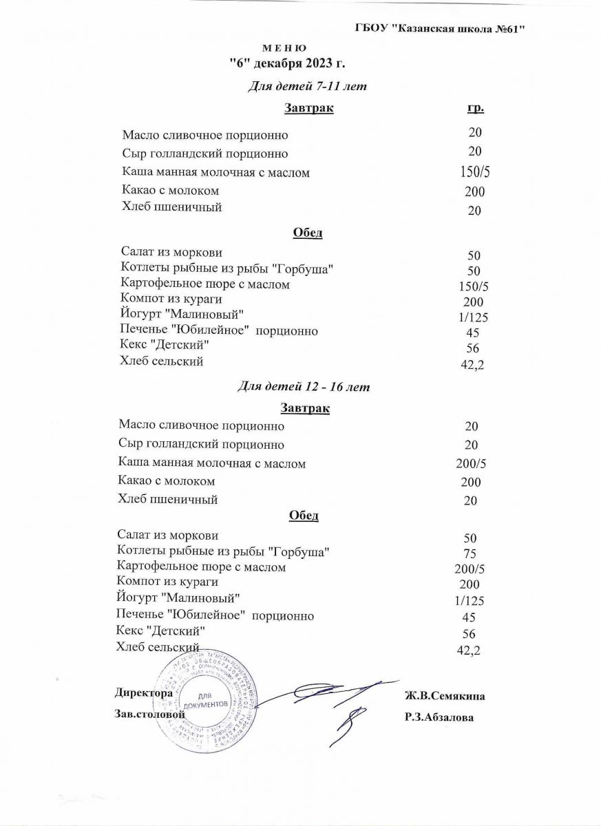 Меню на период с 8 по 13декабря 2022 г.