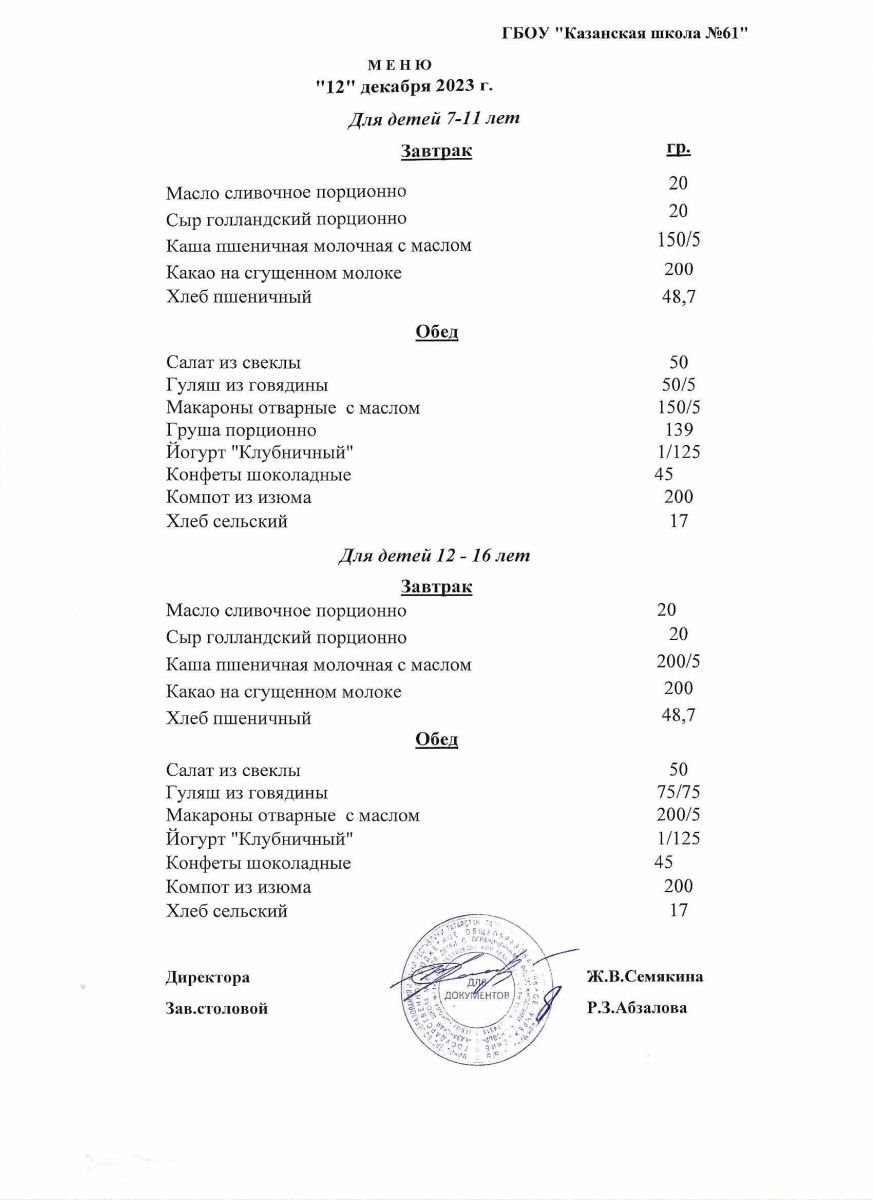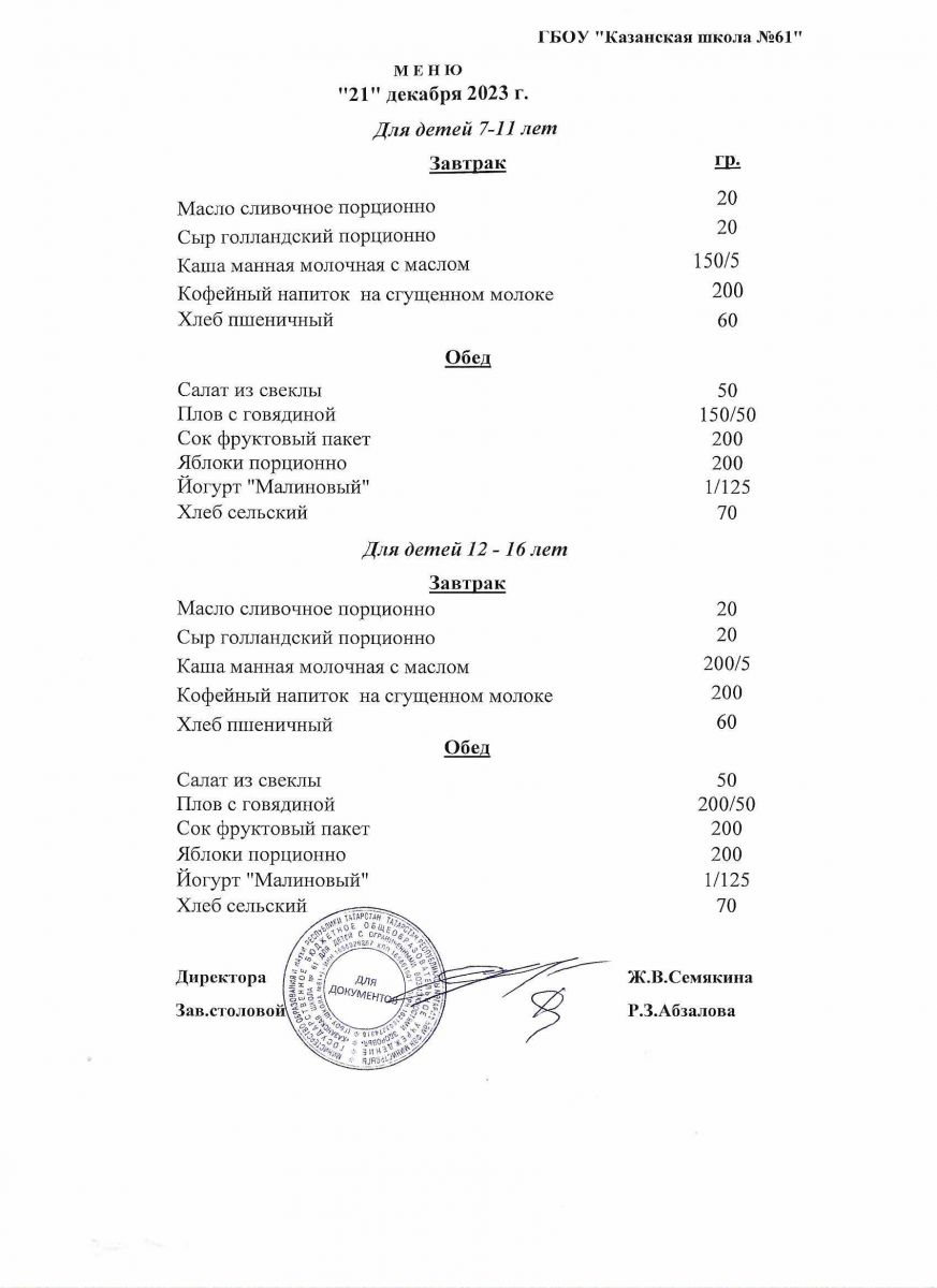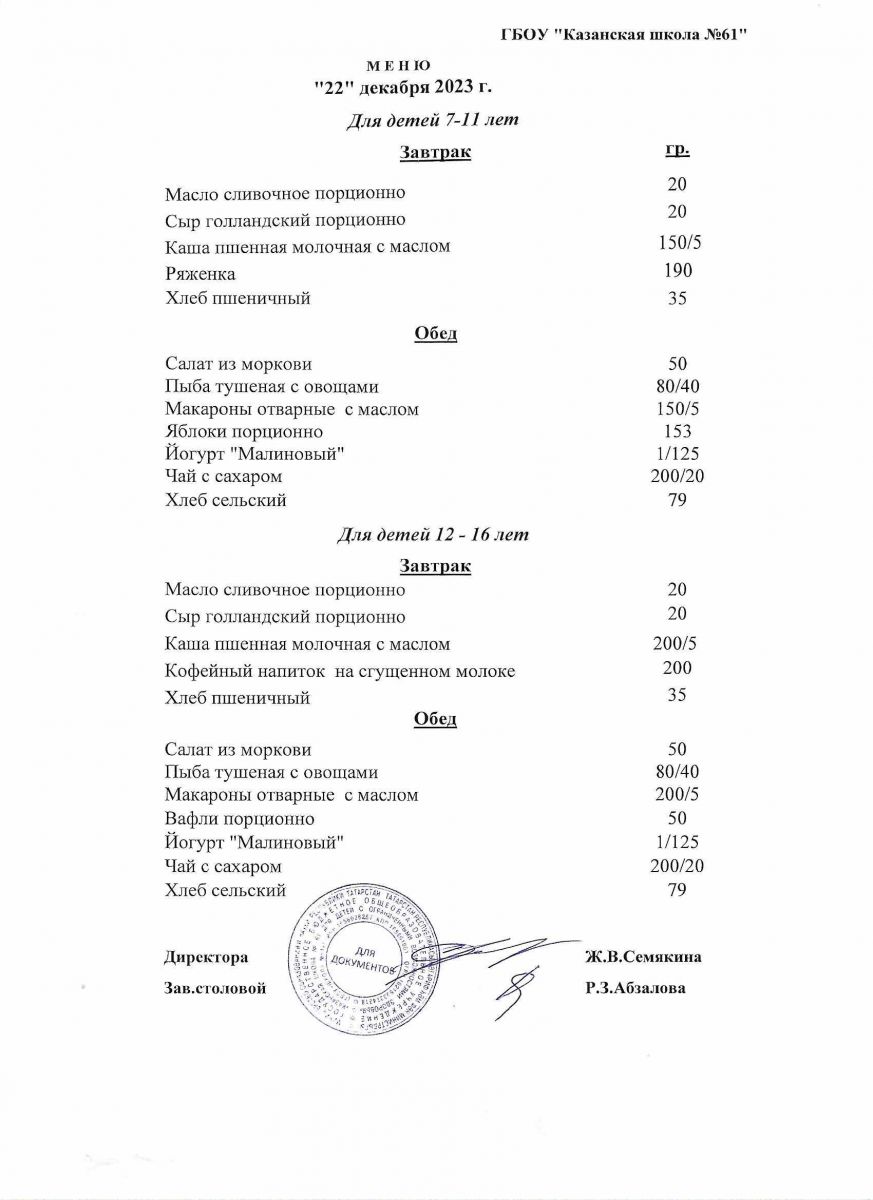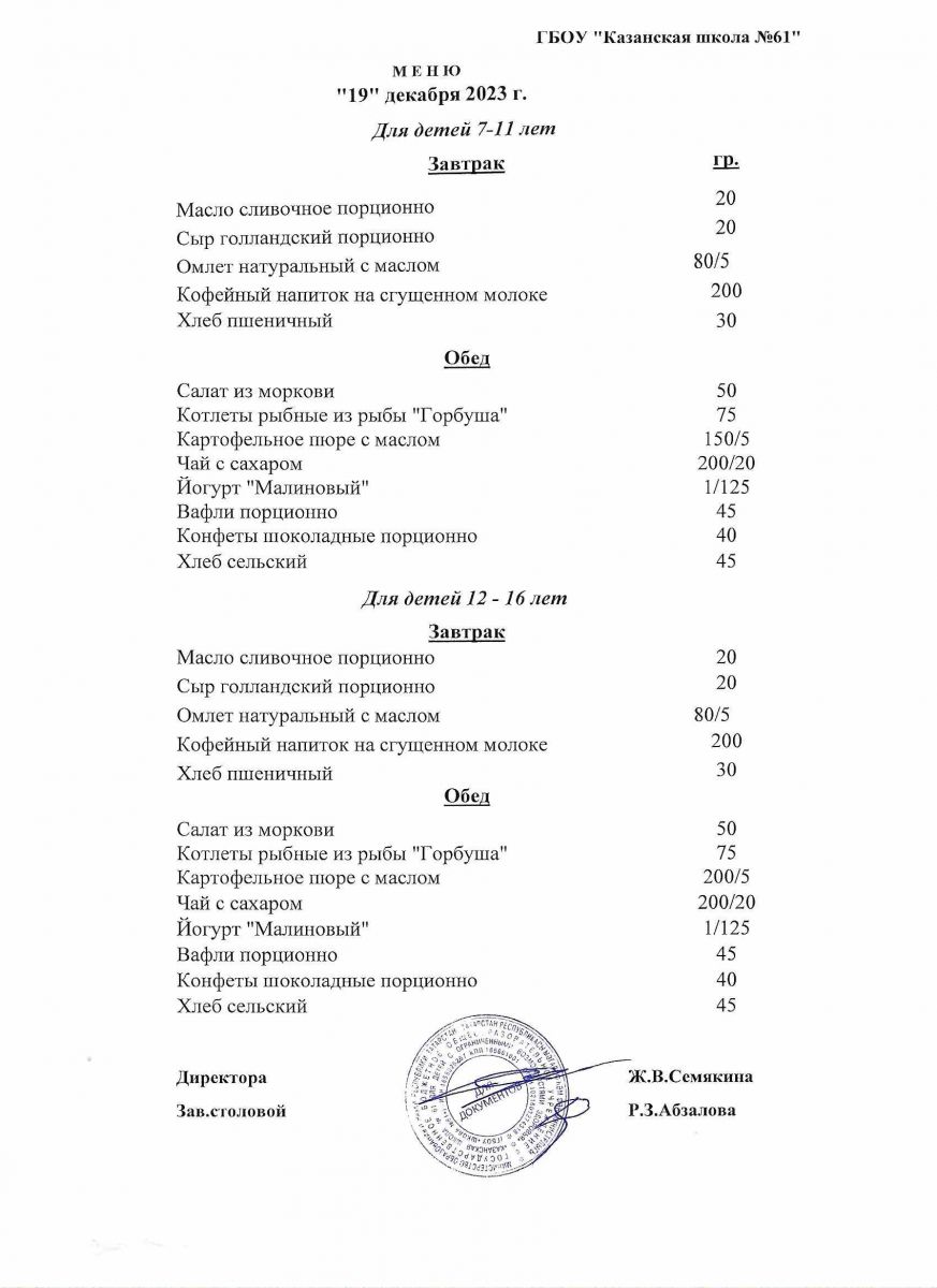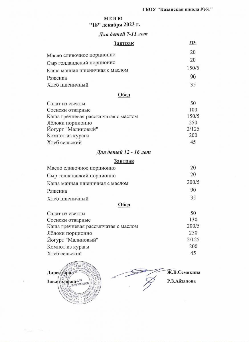 Меню на период с 8 по 13декабря 2022 г.