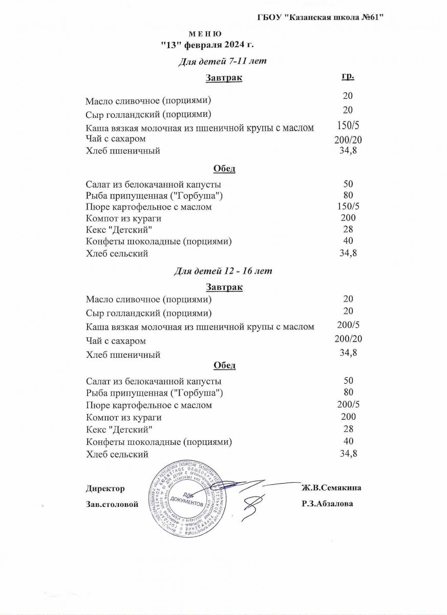Меню на период с 13 по 17 февраля 2023 г