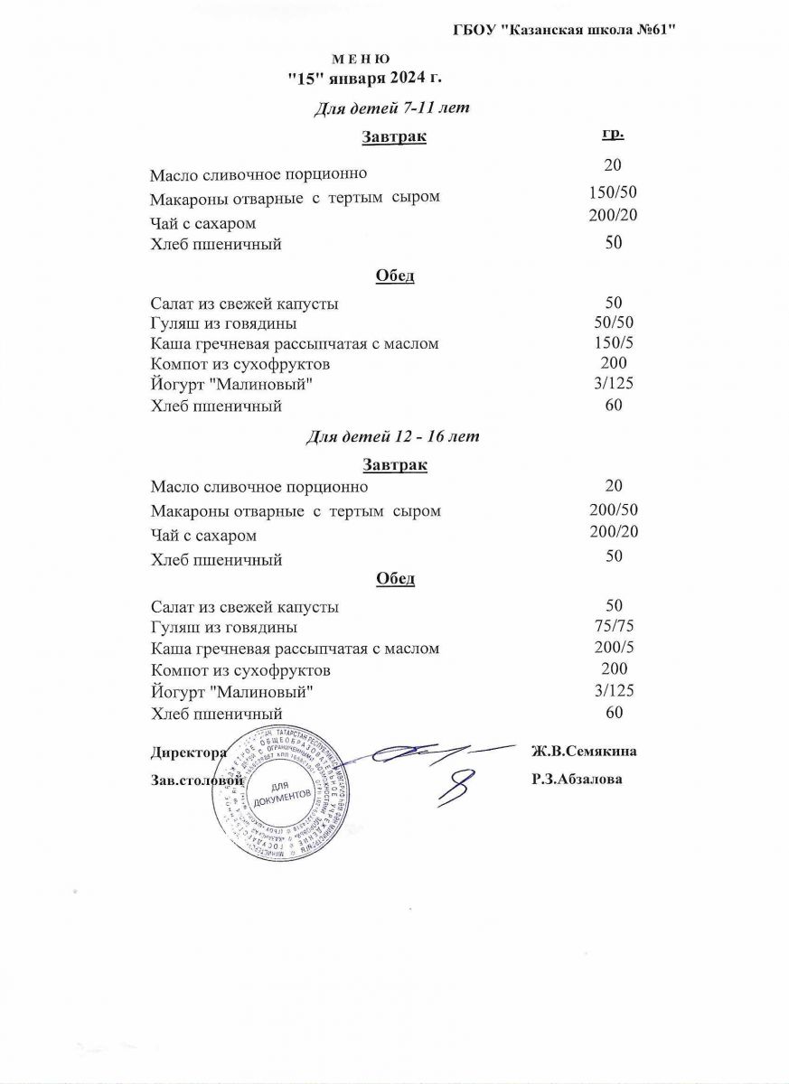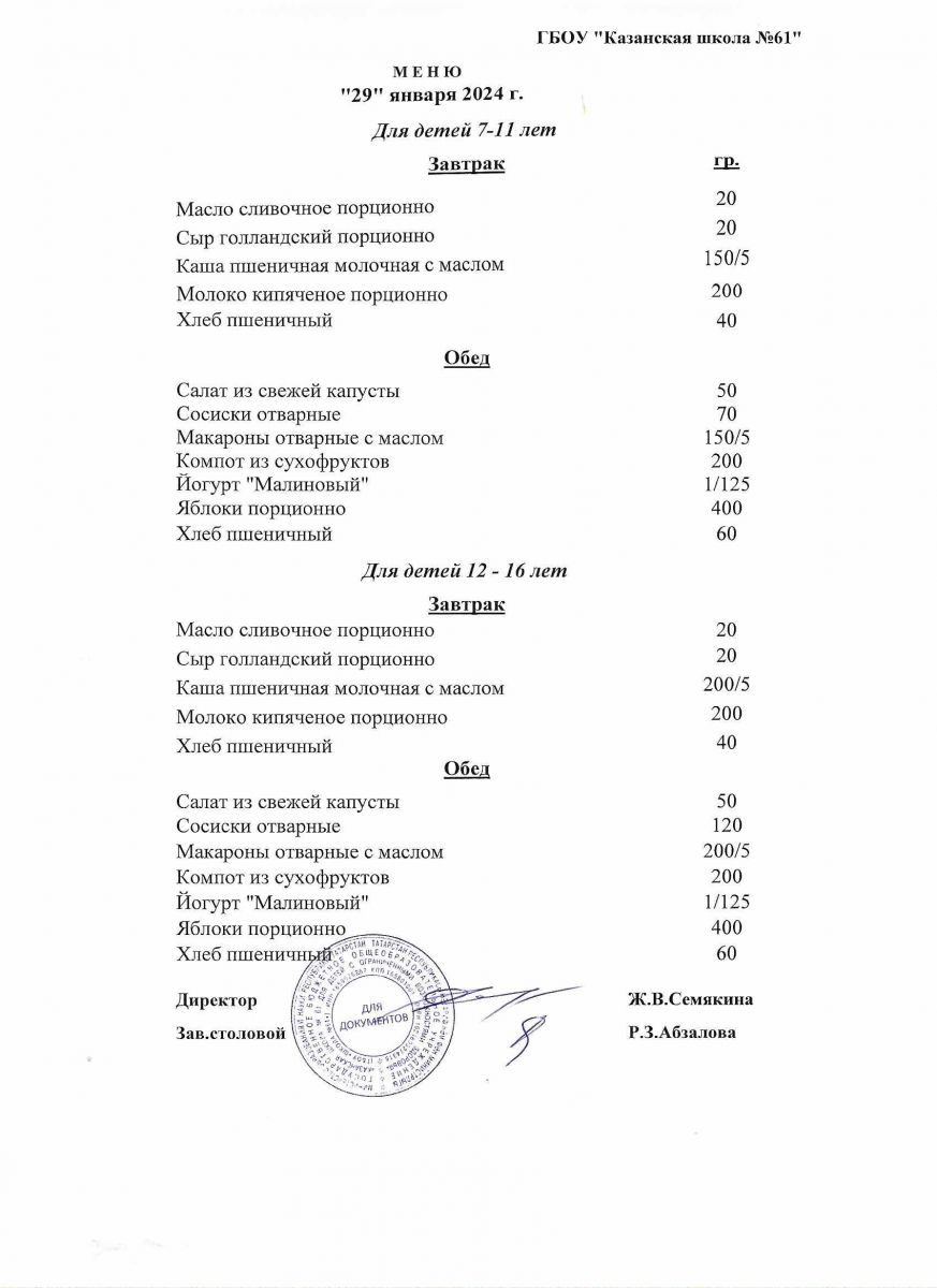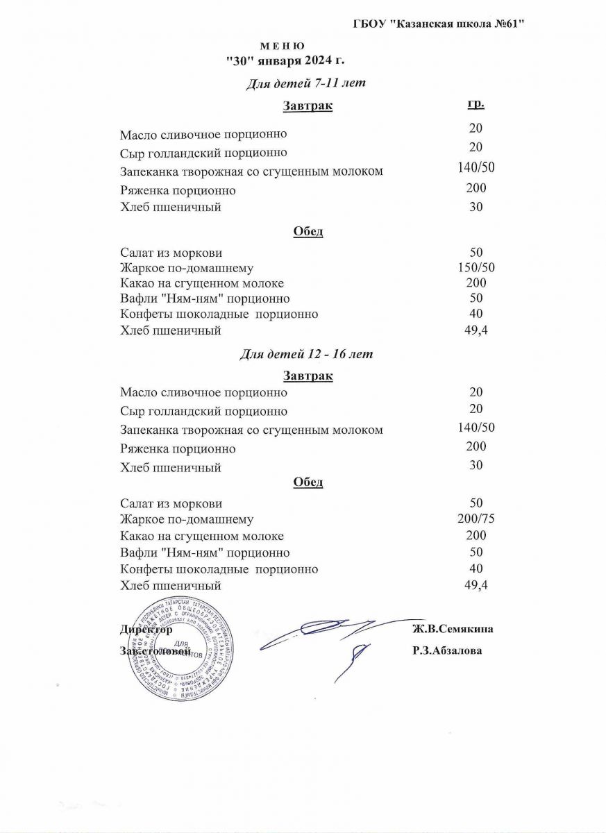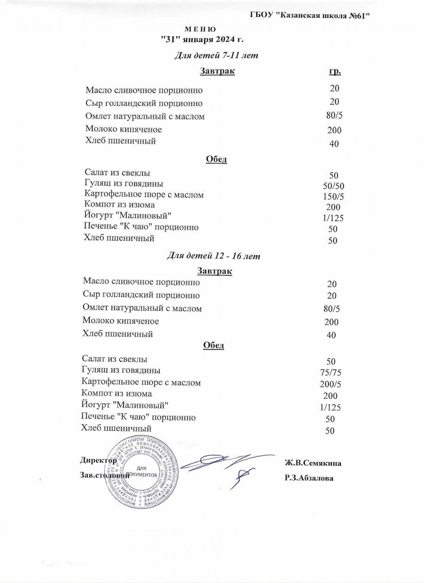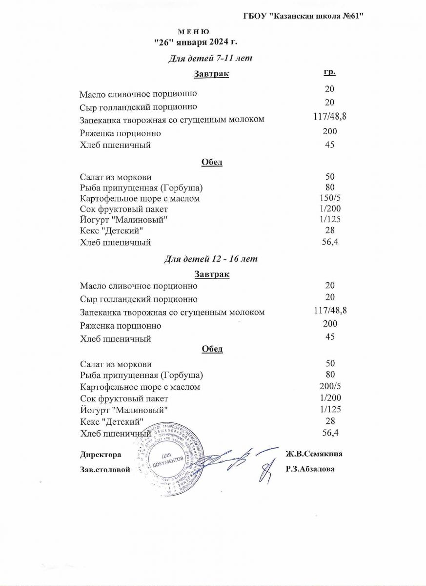 Меню на период с 26 по 31января 2023 г.